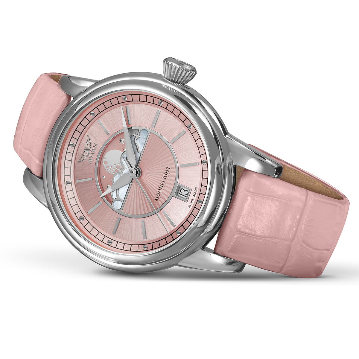 Pod zachwalaną tarczą ukrywa się mechanizm czasomierza Aviator. Każda właścicielka przedstawionego modelu może być pewna dokładnego odmierzania czasu dzięki szwajcarskiemu mechanizmowi Ronda 708, który zasilany jest baterią. System zapewnia również pracę funkcji fazy księżyca i datownika z aktualnym dniem miesiąca, który znalazł swoje miejsce na godzinie 6.