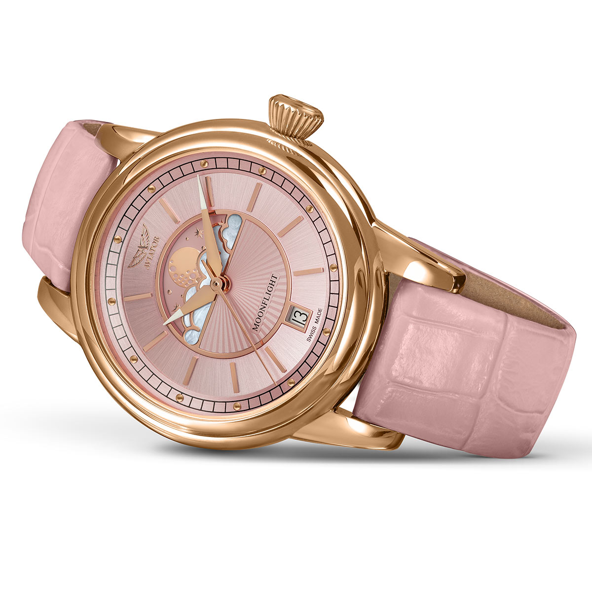 Niezwykle twarde i odporne na zarysowania szkło szafirowe z antyrefleksem chroni różową tarczę z subtelnymi stalowymi indeksami i ostrymi wskazówkami. Wskazówki wyposażone zostały w świecącą luminescencję, która pomoże odczytać aktualną godzinę w całkowitej ciemności. Tarcza ozdobiona została giloszem w postaci promieni słońca i wyposażona w bogatą kolorystycznie subtarcze funkcji faz księżyca — moon phase. Wyjątkowa tarcza moon phase to chmury osadzone w postaci niepowtarzalnej masy perłowej w pozłacanej ramce, gwieździste niebo i błyszczący księżyc w jego wszystkich fazach. Funkcja fazy księżyca to nie tylko przepiękna dla kobiecego oka ozdoba, ale i przydatna mechanika obserwowania księżyca bez wyglądania za okno. Cała tarcza zaprojektowana została w stylu Art Deco, z trójwymiarowym postrzeganiem głębi. Modna kolorystyka czasomierza z pewnością dopasuje się do płci pięknej. Czasomierz będzie idealnym partnerem dla torebek, eleganckich kostiumów i dodatków biżuteryjnych.