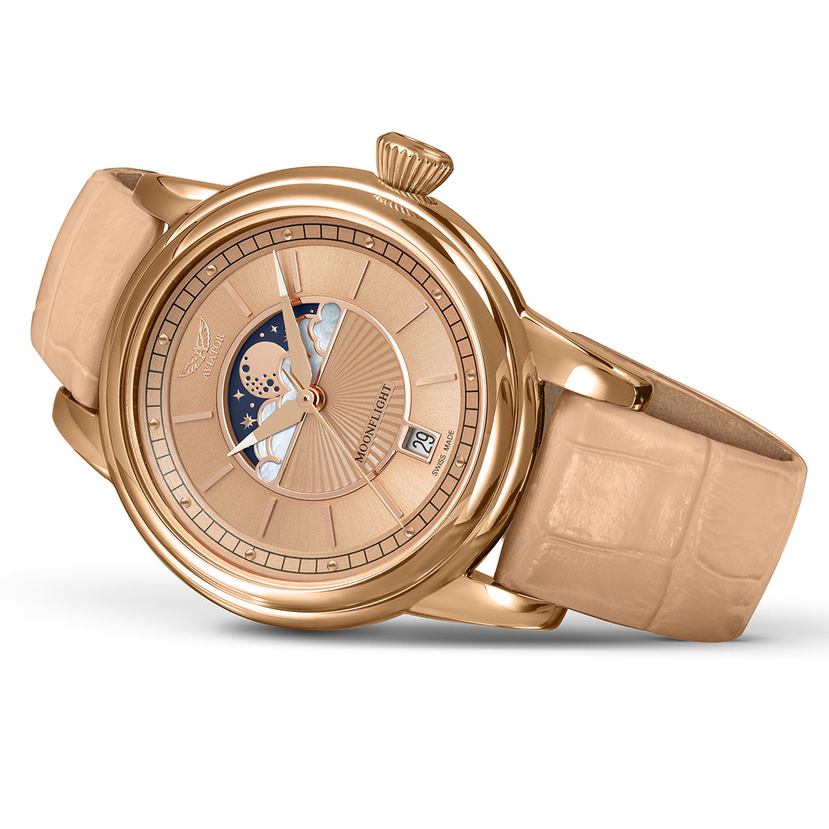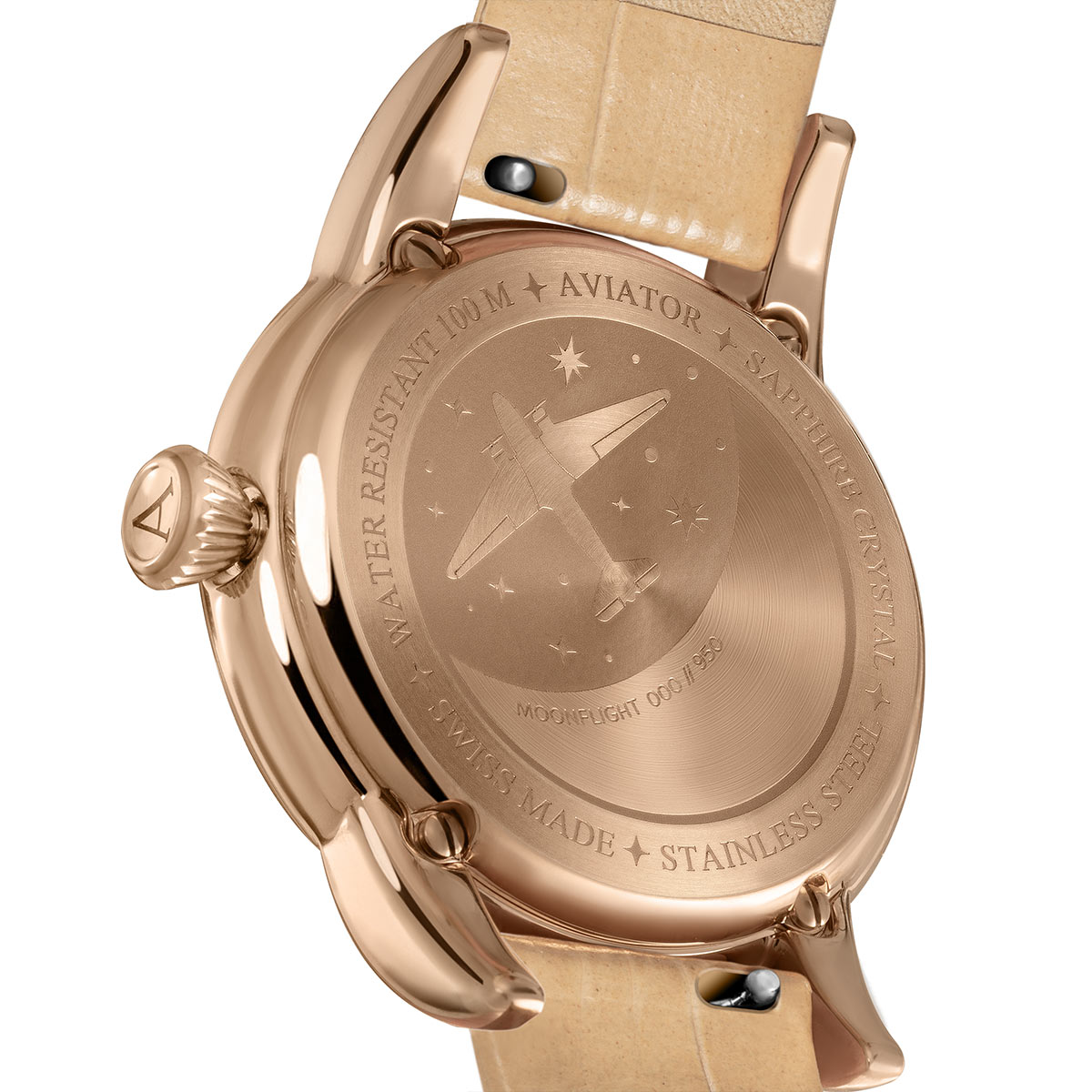 W latach trzydziestych każdy lot legendarnym samolotem Douglas DC-3 zapewniał atmosferę elegancji i luksusu, których nie uraczy się we współczesnych szybkich lotach komercyjnych. W każdym aspekcie Douglas DC-3 podarował światu lepsze spojrzenie na podróże, definiując tym samym Złotą Erę Lotnictwa — damski zegarek Aviator V.1.33.2.260.4 z kolekcji Moonflight jest nawiązaniem do tych czasów i doświadczeń.