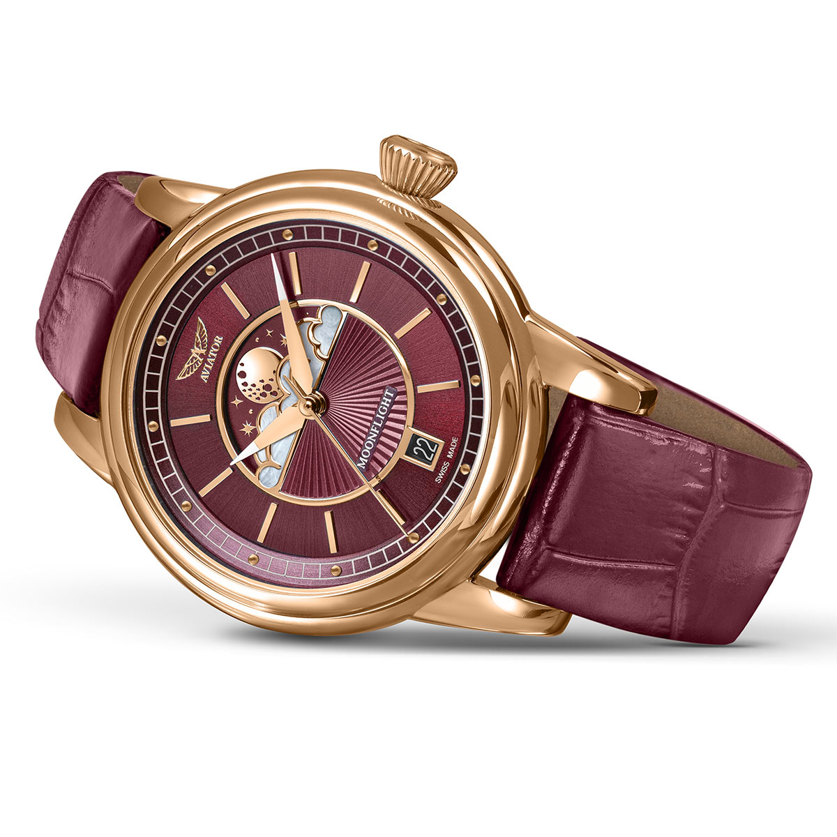 Niezwykle twarde i odporne na zarysowania szkło szafirowe z antyrefleksem chroni bordową tarczę z subtelnymi stalowymi indeksami i ostrymi wskazówkami. Wskazówki wyposażone zostały w świecącą luminescencję, która pomoże odczytać aktualną godzinę w całkowitej ciemności. Tarcza ozdobiona została giloszem w postaci promieni słońca i wyposażona w bogatą kolorystycznie subtarcze funkcji faz księżyca — moon phase. Wyjątkowa tarcza moon phase to chmury osadzone w postaci niepowtarzalnej masy perłowej w pozłacanej ramce, gwieździste niebo i błyszczący księżyc w jego wszystkich fazach. Funkcja fazy księżyca to nie tylko przepiękna dla kobiecego oka ozdoba, ale i przydatna mechanika obserwowania księżyca bez wyglądania za okno. Cała tarcza zaprojektowana została w stylu Art Deco, z trójwymiarowym postrzeganiem głębi. Modna kolorystyka czasomierza z pewnością dopasuje się do płci pięknej. Czasomierz będzie idealnym partnerem dla torebek, eleganckich kostiumów i dodatków biżuteryjnych.