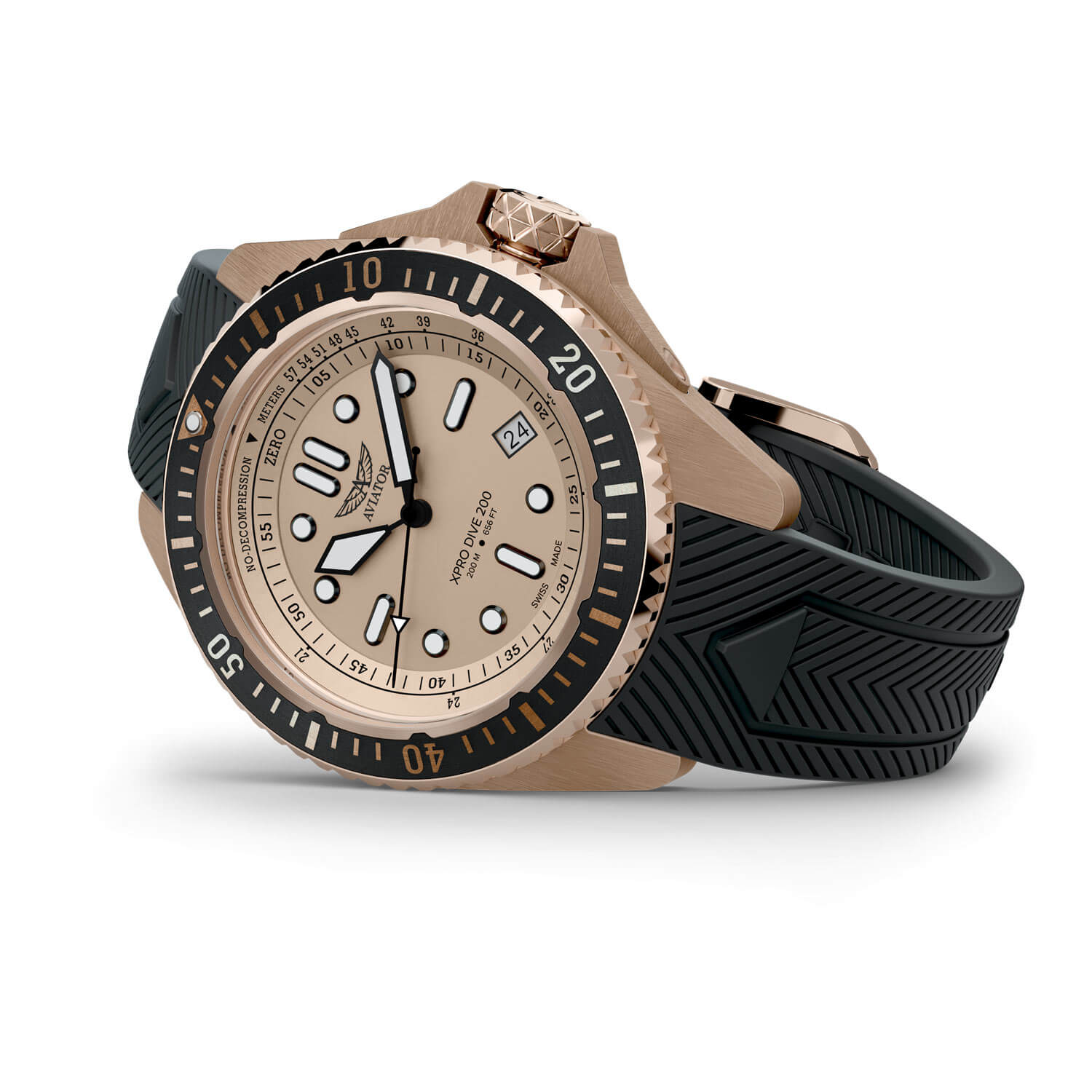 Beżowa tarcza o wysokim kontraście została zaprojektowana z myślą o ekstremalnej czytelności. Duże indeksy i wskazówki pokryto powłoką Super-LumiNova® X1 i BGW9, która po krótkim naświetleniu świeci przez ponad 12 godzin, gwarantując perfekcyjną widoczność w głębinach i po zmroku. Datownik na godzinie czwartej dodaje praktyczności, a pod tarczą pracuje niezawodny szwajcarski mechanizm Ronda 6003.D, zapewniający punktualność w każdych warunkach. Nurkowy zegarek Aviator V.1.42.2.374.6 na gumowym pasku to instrument dla tych, którzy szukają partnera do zadań, nie gadżetu.
