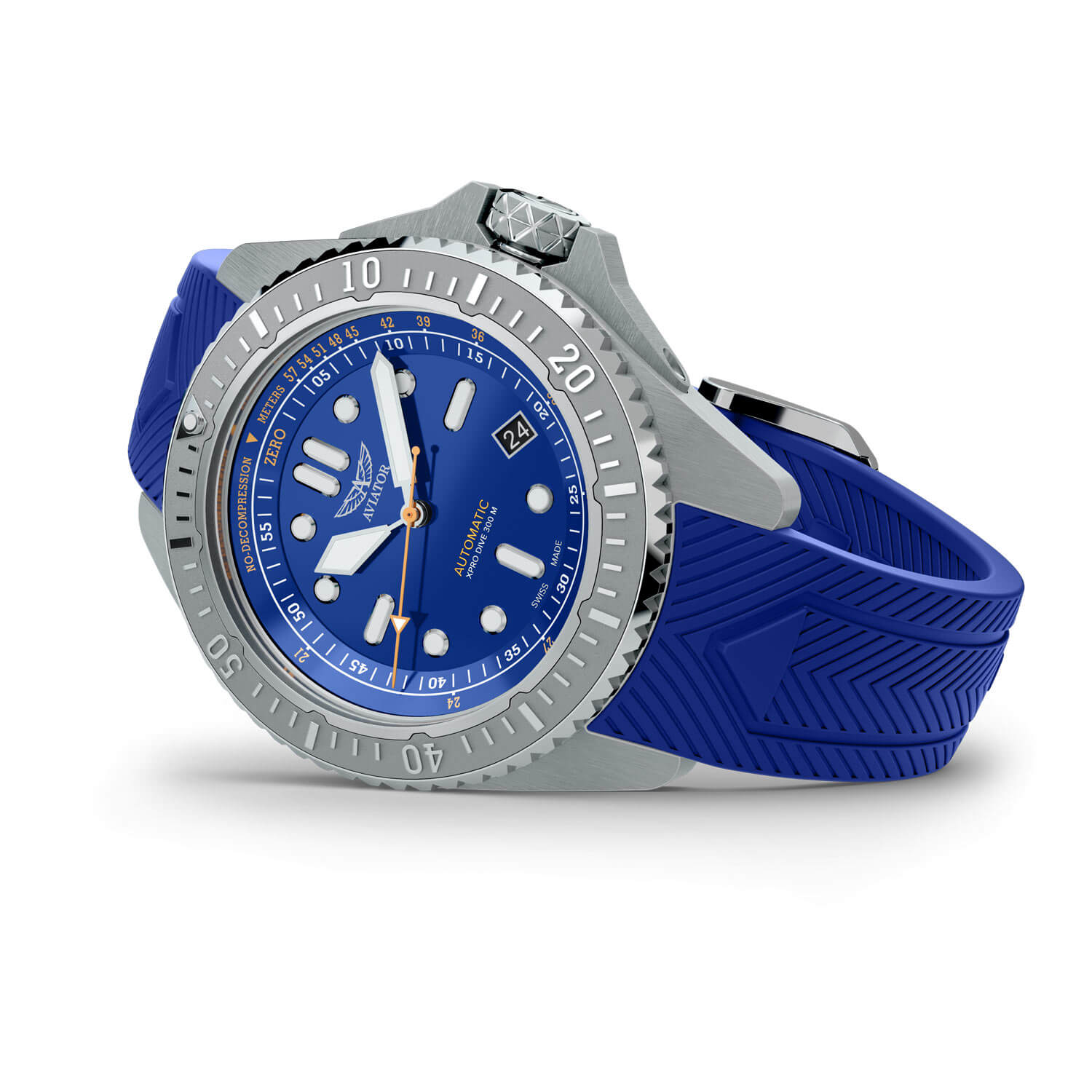 Tarcza w kolorze głębokiego granatu zachowuje maksymalną czytelność w każdych warunkach. Wskazówki i indeksy pokryto Super-LumiNova® X1 i BGW9, które zapewniają intensywne światło nawet przez 12 godzin po naświetleniu. Na godzinie czwartej umieszczono praktyczny datownik, a w sercu zegarka pracuje szwajcarski mechanizm automatyczny Sellita SW200 z 26 kamieniami i rezerwą chodu do 38 godzin. Aviator XPRO DIVE 300 Automatic na pasku gumowym to instrument stworzony do realnych wyzwań — nie ozdoba, lecz narzędzie dla tych, którzy naprawdę żyją w rytmie głębi.
