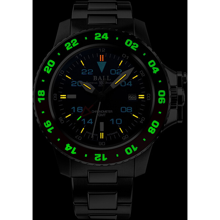 Ball Engineer Hydrocarbon AeroGMT II DG2018C-S3C-BE zegarek z najjaśniejszym na świecie, obrotowym bezelem. Zegarek Ball zapewnia natychmiastową widoczność przy słabym oświetleniu dzięki przełomowej, dwukolorowej ramce osadzonej na górze koperty. Tak samo jak indeksy na tarczy i wskazówki zawiera ona mikro-rurki z gazem trytowym, które świecą nieustannie przez 25 lat. Odporne na zarysowania szkło szafirowe znajdziemy nie tylko na kopercie, ale i w dwukierunkowej, obrotowej lunecie z czasem 24 godzinnym.