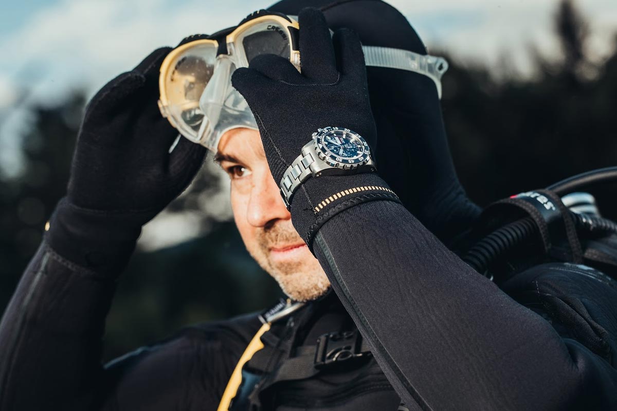 Całość osłania najwyższej jakości szkło szafirowe, którego właściwości zapewnią spokój o zarysowania, a także zagwarantują lustrzaną przejrzystość. Powłoka antyrefleksyjna, natomiast, zniesie komplikacje spowodowane niepożądanym odbiciom światła od cyferblatu, wspomagając niezawodność w odczycie czasu. Innym, od razu rzucającym się w oczy komponentem czasomierza, jest jego obrotowy, ceramiczny bezel, którego materiał niewątpliwie przydaje mu tyle samo wartości praktycznej, co aparycyjnej. I ostatnim już elementem, nad którym warto się również pochylić, jest tytanowa bransoleta. Użyty przy produkcji przyrządu tytan stanowi niezwykle trafny wybór, a to za sprawą korzystnego stosunku twardości, co do ciężaru. Bransoleta zegarka będzie zatem niezwykle wytrzymała, ale równocześnie niewadząca masą, a przy tym dzięki swej srebrnej barwie idealnie komponując się z tarczą. Tytan to materiał całkowicie antyalergiczny i lżejszy od stali o około 40%. Ergonomiczna, składana, stalowa klamra z 22-milimetrowym przedłużeniem, doda jej użytkownikowi komfortu podczas dopasowania odmierzacza do ręki, czy w razie konieczności nałożenia go na skafander do nurkowania.