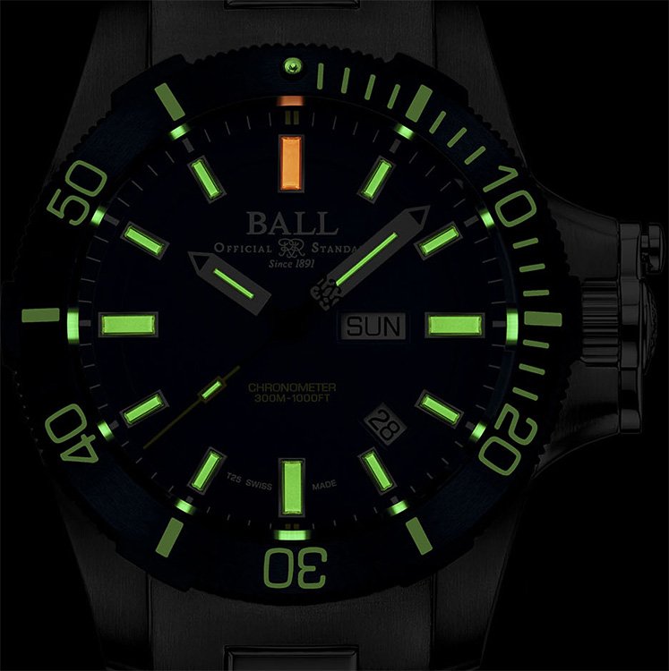 Ball Engineer Hydrocarbon Submarine Warfare DM2276A-S3CJ-BE to profesjonalny nurek o śmiałym nastawieniu, został stworzony, aby zejść w najciemniejsze głębiny morskie z mocną jasnością. Submarine Warfare oświetla upływający czas z 16 świecącymi w ciemności pałeczkami trytowymi. Znaczniki godzin na tarczy zbudowane są z szerokich rurek w kolorze zielonym i pomarańczowym zapewniając pełną czytelność. Amortiser® opatentowany system anty-wstrząsowy i opatentowana ochrona koronki zapewniają wytrzymałość nawet w kontakcie z ekstremalnymi żywiołami.