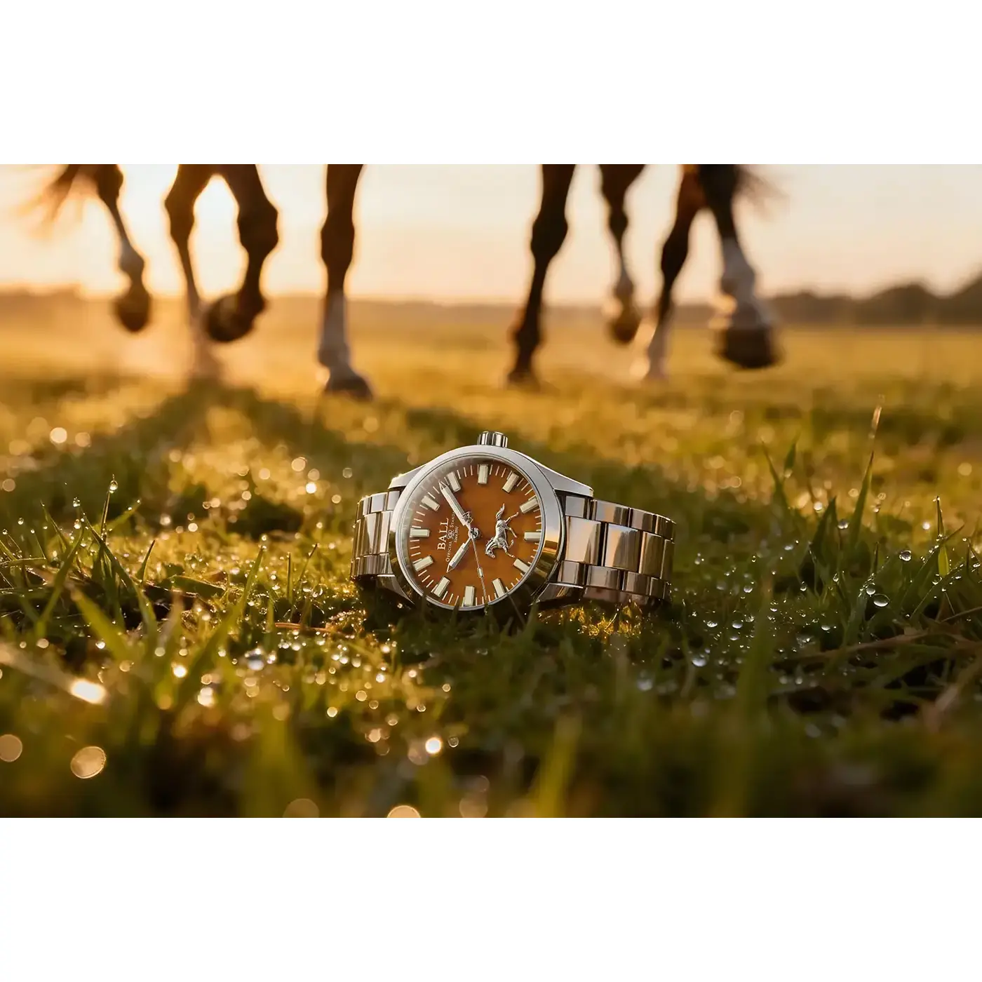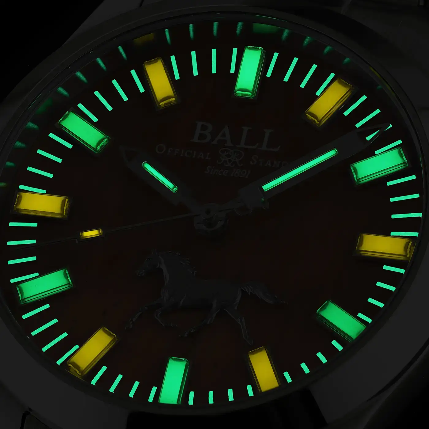 Ball Engineer II Galloping Horse NM9016C-S11-YTE to szwajcarski zegarek z naciągiem automatycznym i tarczą z tygrysiego oka, w którym bezkompromisowa inżynieria spotyka się z głęboką symboliką dalekowschodnią. Model ten stanowi bezpośredni hołd dla chińskiego Roku Ognistego Konia, uosabiającego witalność, niezależność oraz niepohamowany pęd do działania. Zgodnie z tradycyjną koncepcją Pięciu Żywiołów ogień odżywia ziemię, dlatego tarczę czasomierza wycięto z naturalnego tygrysiego oka, przypisanego właśnie żywiołowi ziemi. Ten szlachetny kamień, symbolizujący odwagę i rezyliencję, generuje fascynujący efekt optyczny, płynnie zmieniając nasycenie złocistobrązowych pasm w zależności od kąta padania światła. Cyferblat wzbogacono o trójwymiarową aplikację pędzącego ogiera oraz sekundnik z przeciwwagą w kształcie chińskiego znaku kaligraficznego oznaczającego konia.