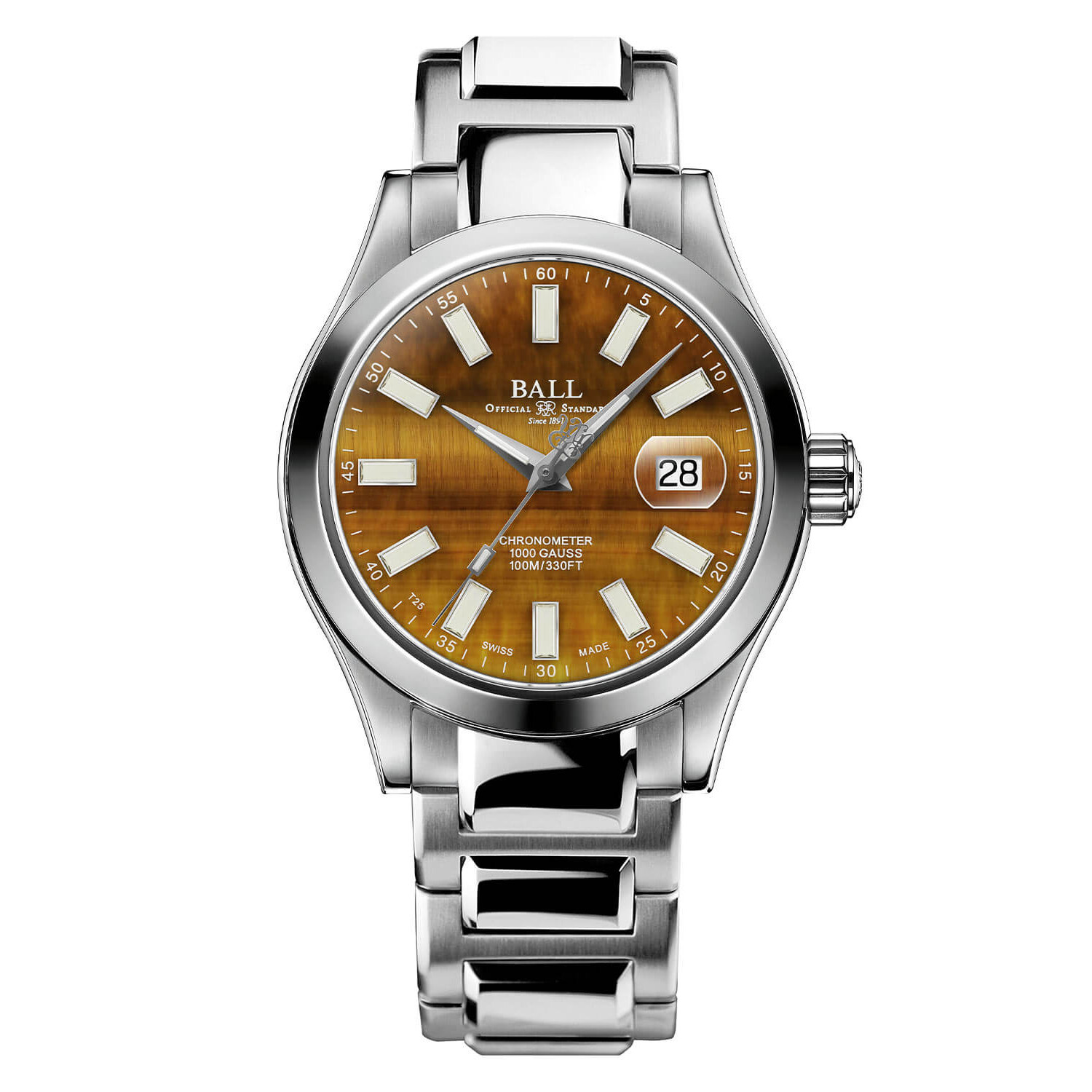 Tarcza tego modelu wykonana została z wyjątkowego kamienia tygrysiego oka, którego złoto-brązowe refleksy zmieniają się w zależności od kąta padania światła. To nie tylko imponujący element wizualny, ale także symbol siły, odwagi i niezależności. Dodatkowo trytowe mikrorurki na indeksach i wskazówkach zapewniają nieprzerwaną luminescencję, gwarantując doskonałą widoczność w ciemności. W sercu zegarka pracuje precyzyjny szwajcarski mechanizm automatyczny, którego dokładność potwierdza certyfikat COSC. Mechanizm został zabezpieczony systemem Amortiser®, chroniącym przed wstrząsami o sile do 5000Gs.