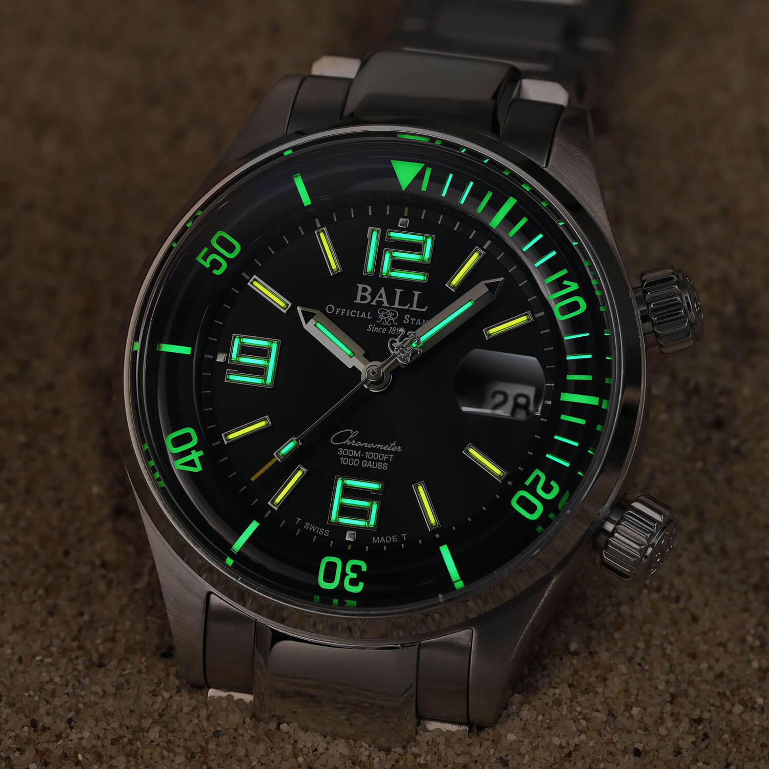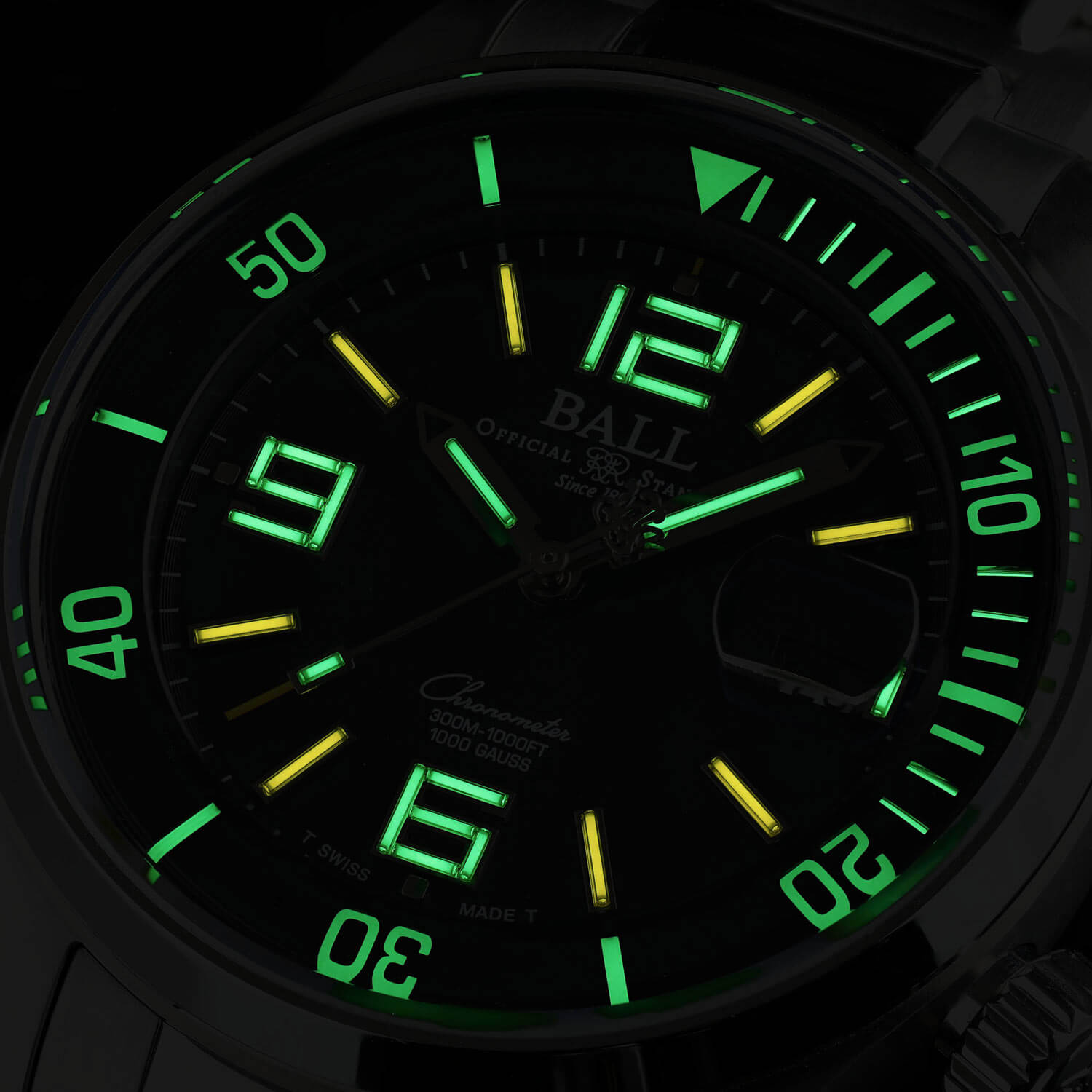 Jednym z najbardziej charakterystycznych elementów Ball Engineer Master II Diver Chronometre DM2280A-S6C-BK są mikrogazowe rurki umieszczone na wskazówkach i indeksach. Dzięki nim ten limitowany zegarek emituje stałe światło przez 25 lat, niezależnie od warunków oświetleniowych. Żółto-zielona poświata pozwala z łatwością odczytać godzinę, nawet w najciemniejszych głębinach oceanu. W połączeniu z eleganckim szlifem słonecznym na tarczy te detale sprawiają, że czasomierz zachwyca zarówno funkcjonalnością, jak i estetyką. Szwajcarski zegarek męski Ball Automatic DM2280A-S6-BK wyposażony jest w szwajcarski mechanizm marki Ball kaliber RR1101-C, napędzany ruchem nadgarstka. Doskonała precyzja i solidne elementy to wizytówka mechanizmu, który wykorzystany jest do budowy tego wyjątkowego czasomierza. Zbadany przez szwajcarski instytut Contrôle Officiel Suisse des Chronomètres układ otrzymał certyfikat dokładnego chodu COSC, co udowadnia jego doskonałą jakość.