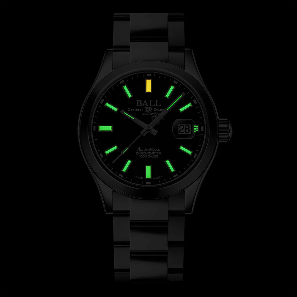 Zegarek męski na bransolecie Ball Engineer Master II Endurance 1917 Limited Edition NM3000C-S2C-BE zabezpiecza opatentowany system przeciwwstrząsowy Amortiser®, a wzmacnia olej odporny na niskie temperatury. Ten drugi umożliwia pomiar czasu przy temperaturze sięgającej nawet do -45 stopni Celsjusza! Szwajcarski kaliber automatyczny BALL RR1103-C oraz cała jego funkcjonalność jest również chroniona przez antymagnetyczną technologię ochronną. Za jej dostarczanie odpowiedzialna jest osłonka z mu-metalu, która zapewnia niezwykle solidną ochronę przed polami magnetycznymi do 1000 Gaussów (80 000 A/m).