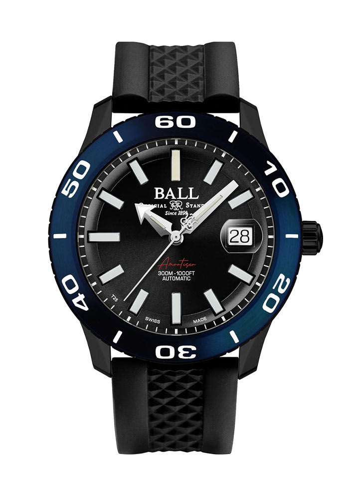 Zegarek w stylu militarnym Ball wykonany jest ze stali nierdzewnej, co sprawia, że jest trwały i odporny na uszkodzenia. Dodatkowym wzmocnieniem koperty jest powłoka PVD w tym modelu w kolorze czarnym. Przedstawiony zegarek Ball oferowany jest w rozmiarze 40.50 mm na gumowym pasku. Rozmiar pozwoli zegarkowi dopasować się do każdego męskiego nadgarstka, a pasek zagwarantuje komfort i w czasie użytkowania tego modelu. Miękki i elastyczny pasek cechuje odporność na wodę. Wysoka wodoszczelność do 300 metrów sprawia, że zegarek nurkowy Ball można zabrać na podwodną eksplorację bez obawy o jego uszkodzenie. Zakręcana koronka umieszczona tradycyjnie po prawej stronie oraz zakręcany dekiel to niezwykle ważne elementy zabezpieczające całą konstrukcję. W czasie nurkowania przydatnym dodatkiem będzie obrotowy bezel. Luneta z czytelną skalą minutową na niebieskim pierścieniu umieszczona została na froncie obudowy zegarka.