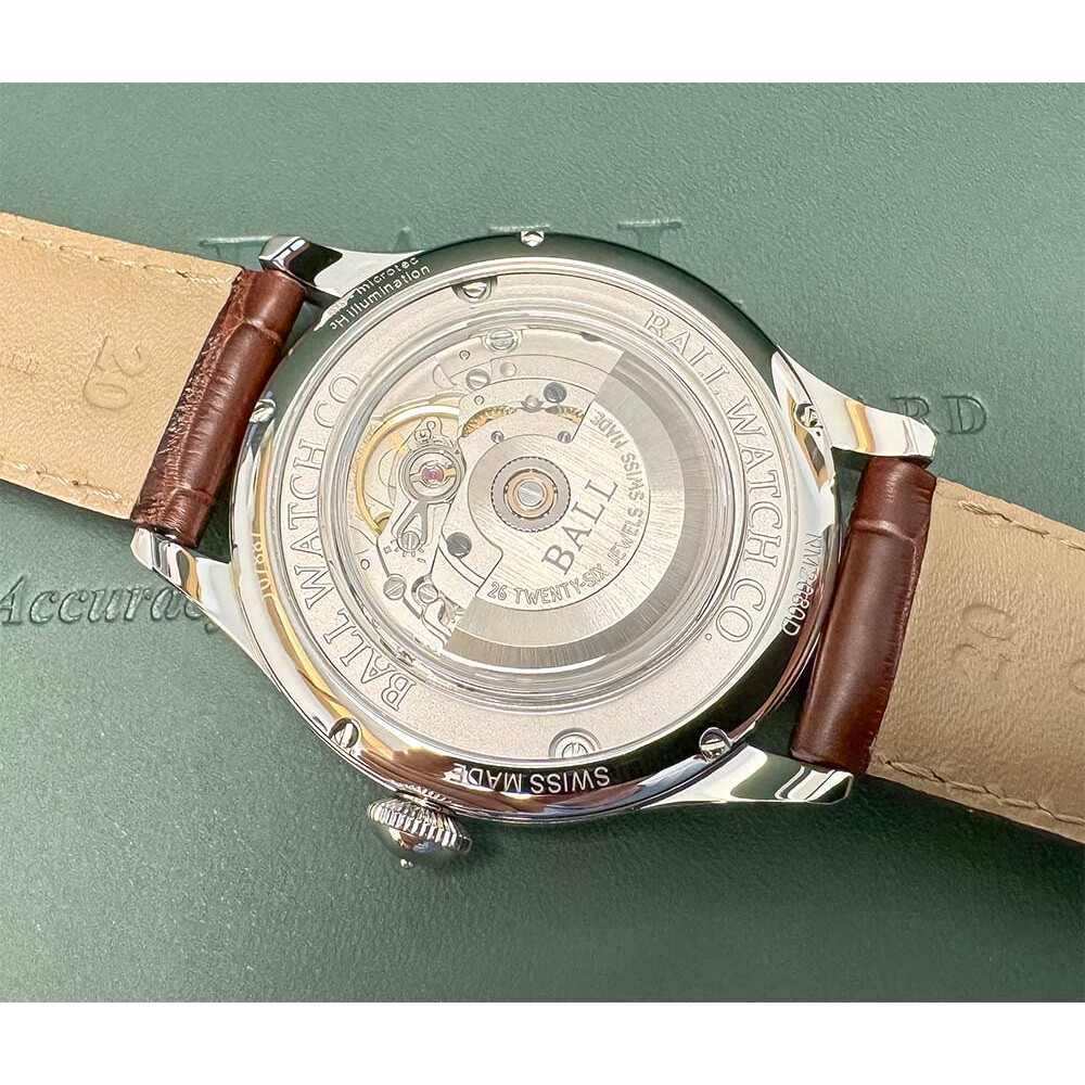 Front zegarka przykuwa uwagę hipnotyzującą tarczą w odcieniu lodowego błękitu. Ta wyjątkowa cecha modelu Ball sprawia, że wyróżnia się on na tle innych czasomierzy, dodając każdemu strojowi nutę chłodnego wyrafinowania. Antyrefleksyjne szafirowe szkło, które chroni tarczę, zapewnia nie tylko doskonałą odporność na zarysowania, ale także znakomitą widoczność w różnych warunkach oświetleniowych, podkreślając tym samym najwyższą jakość i funkcjonalność zegarka. Dodatkowo 14 mikrogazowych rurek na tarczy gwarantuje doskonałą widoczność po zmroku, co zapewnia spójne i niezawodne odmierzanie czasu nawet w słabym oświetleniu. Zegarek BALL z kolekcji Trainmaster Eternity, to światowe dziedzictwo marki Ball. Klasyczny zegarek Ball na skórzanym pasku wykonany został w absolutnym szacunku dla niezawodności, precyzji i tradycyjnej spuścizny Ball.