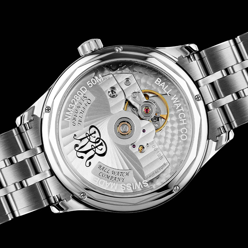 Mężczyźni pracujący na kolei wymagali solidnych narzędzi z myślą o praktyczności i trwałości. Wiedząc o tym, Webb C. Ball zaprojektował zegarki zapewniające natychmiastowy i jasny odczyt czasu. Spuścizna założyciela marki trwa do dziś, Ball Trainmaster Manufacture 80 Hours z 15 pałeczkami z trytem na wskazówkach i cyferblacie pozwalają na szybkie i klarowne odczytanie czasu w ciemności. Ekstremalnie zakrzywiona i elegancka tarcza w kolorze czarnym jest wolna od niepotrzebnych szczegółów, które mogłyby wpłynąć na jej czytelność. Dyskretny, czerwony element na godzinie dwunastej nawiązuje do sekundnika, a napis "Chronometer" i "80POWERHRS" informują o niebanalnym sercu zegarka. Odporność na wstrząsy 5.000Gs, klasa szczelności 5 bar/50M oraz odporność na pole magnetyczne 4 800A / m. Koperta o średnicy 40 mm połączona jest z bransoletą, której matowe i polerowane wykończenie przypominają tory kolejowe.