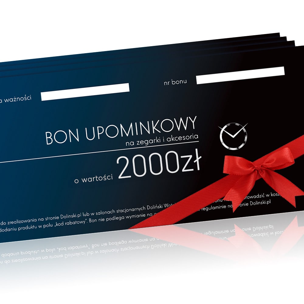 To bez wątpienia modny i elegancki prezent dla każdego. Zakupione bony można sumować. Bony mogą być wykorzystane na zakup dowolnych zegarków i akcesoriów w naszych sklepach stacjonarnych oraz sklepie internetowym Dolinski.pl. Jeśli szukasz pomysłu na prezent, nie ryzykuj! Obdarowany sam decyduje, na jakie produkty zrealizuje swój bon upominkowy. To gwarancja udanego i eleganckiego prezentu.