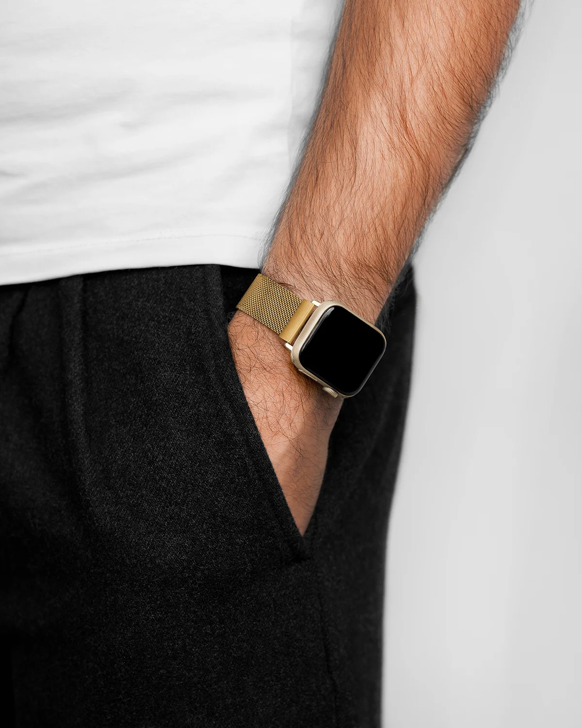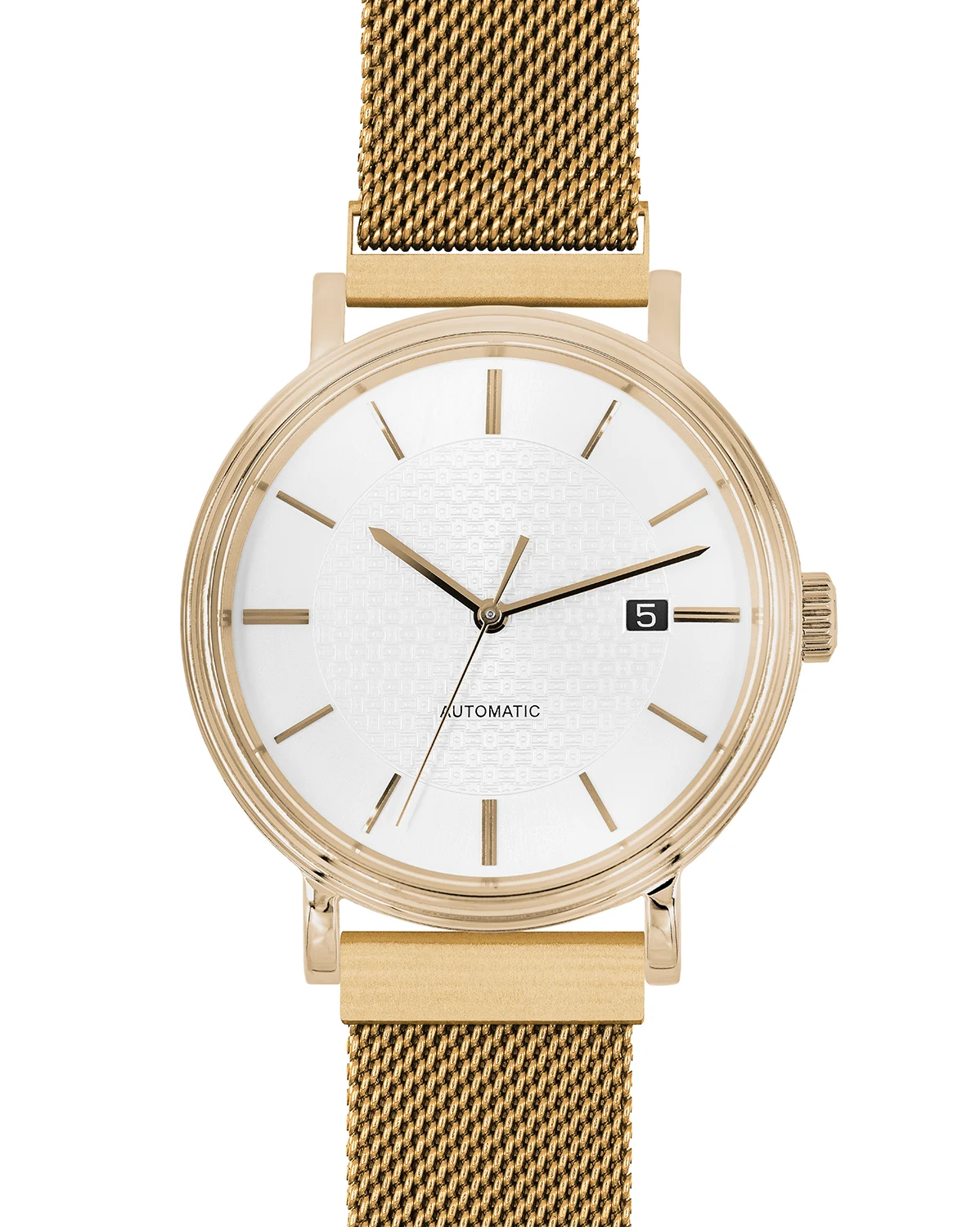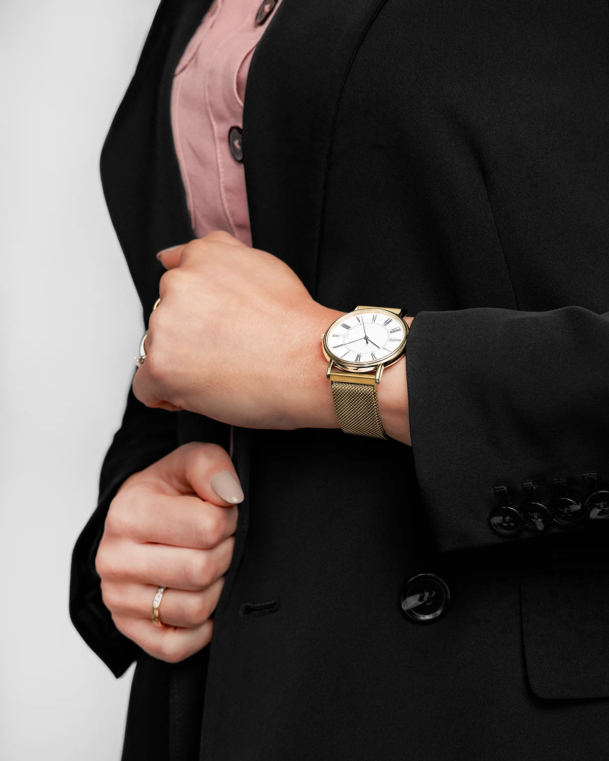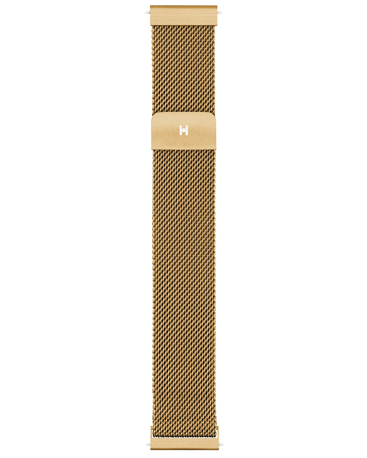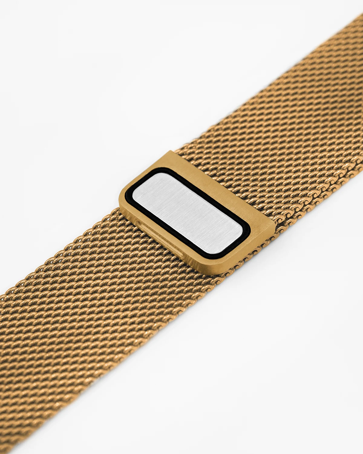 Jej matowe, złote wykończenie dodaje biżuteryjnego charakteru, dzięki czemu model sprawdza się zarówno w codziennych stylizacjach, jak i w bardziej oficjalnych sytuacjach. Splot jest jednocześnie solidny i przewiewny, co zapewnia wysoki komfort noszenia nawet przez wiele godzin. Dzięki konstrukcji typu Quick Release wymiana bransolety jest wyjątkowo szybka i nie wymaga użycia narzędzi – jeden ruch wystarczy, by nadać zegarkowi zupełnie nowy wygląd.