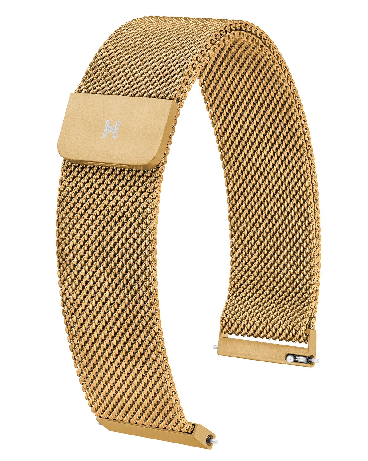 Złocona bransoleta Hirsch Milanaise z wysokiej jakości stali nierdzewnej, wyposażona w magnetyczne zapięcie i wygodny system Quick Release. Idealna do zegarków i smartwatchy.