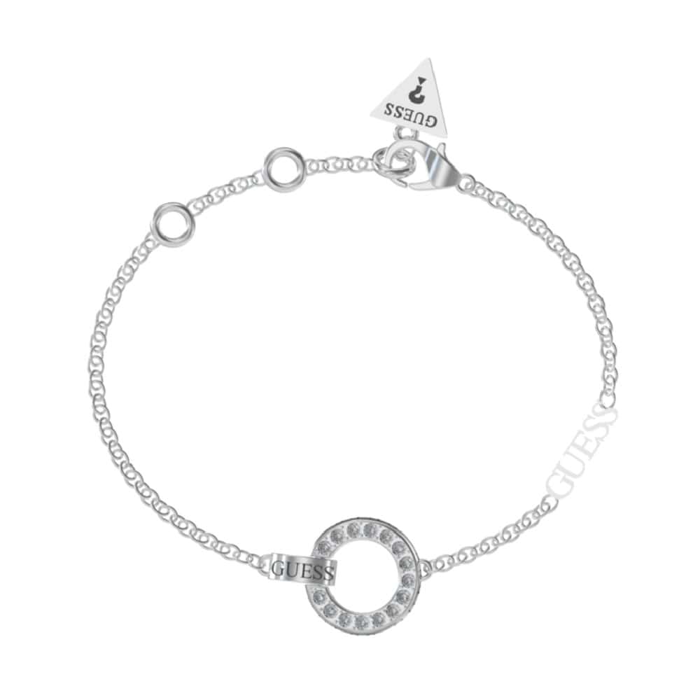 Guess Circle Lights to srebrna bransoletka damska na delikatnym łańcuszku z napisem GUESS i okrągłą zawieszką z cyrkoniami.