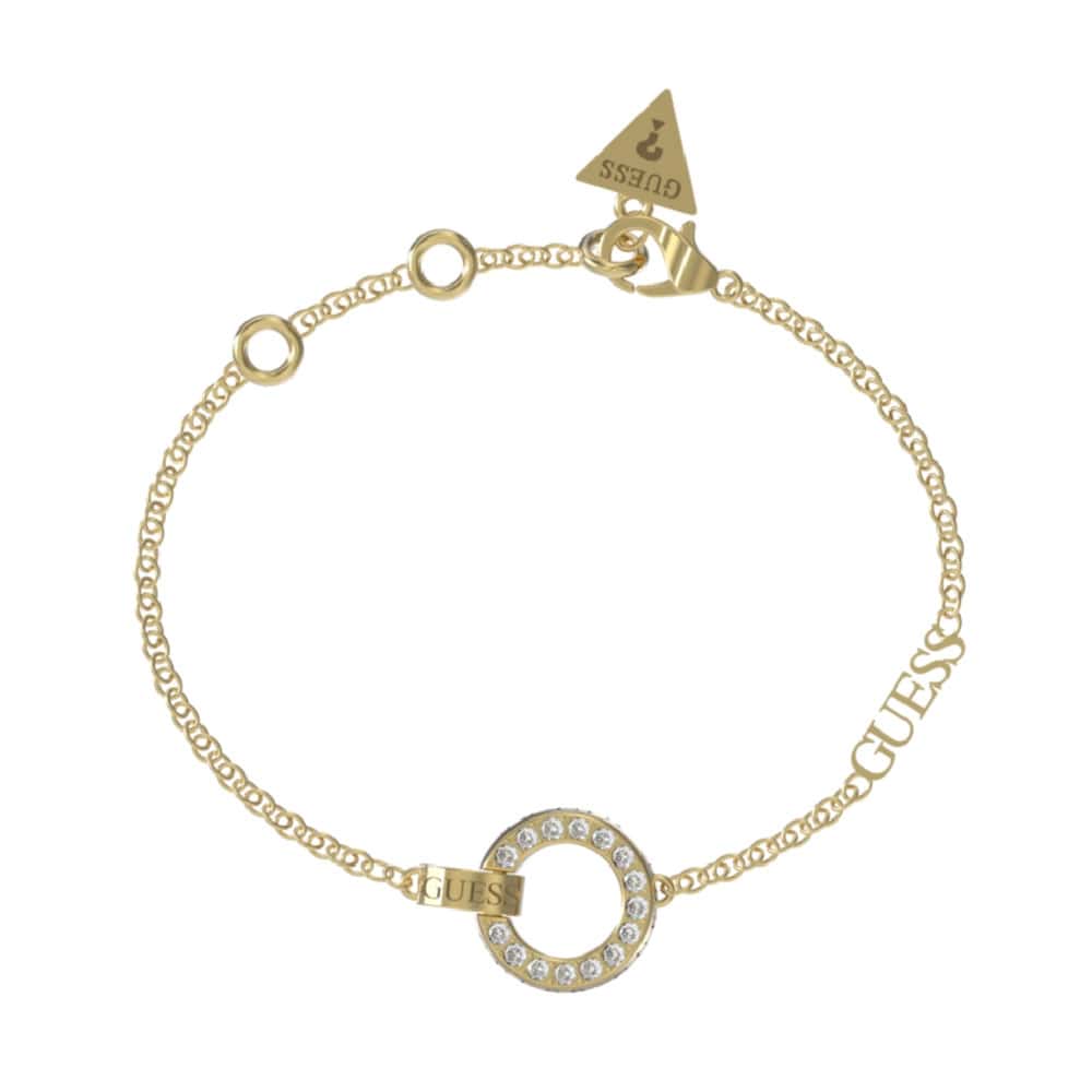 Guess Circle Lights to złota bransoletka damska na delikatnym łańcuszku z napisem GUESS i okrągłą zawieszką z cyrkoniami.