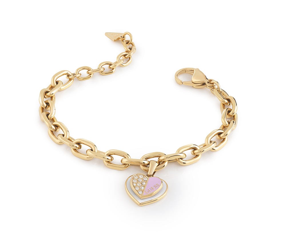Platerowana złotem stalowa bransoletka Guess Lovely Guess JUBB03034JWYGLCS. Łańcuszek z szerokimi ogniwami wzbogacony o podwójny charms w kształcie serduszka z emaliowaną aplikacją i sześciennymi cyrkoniami.