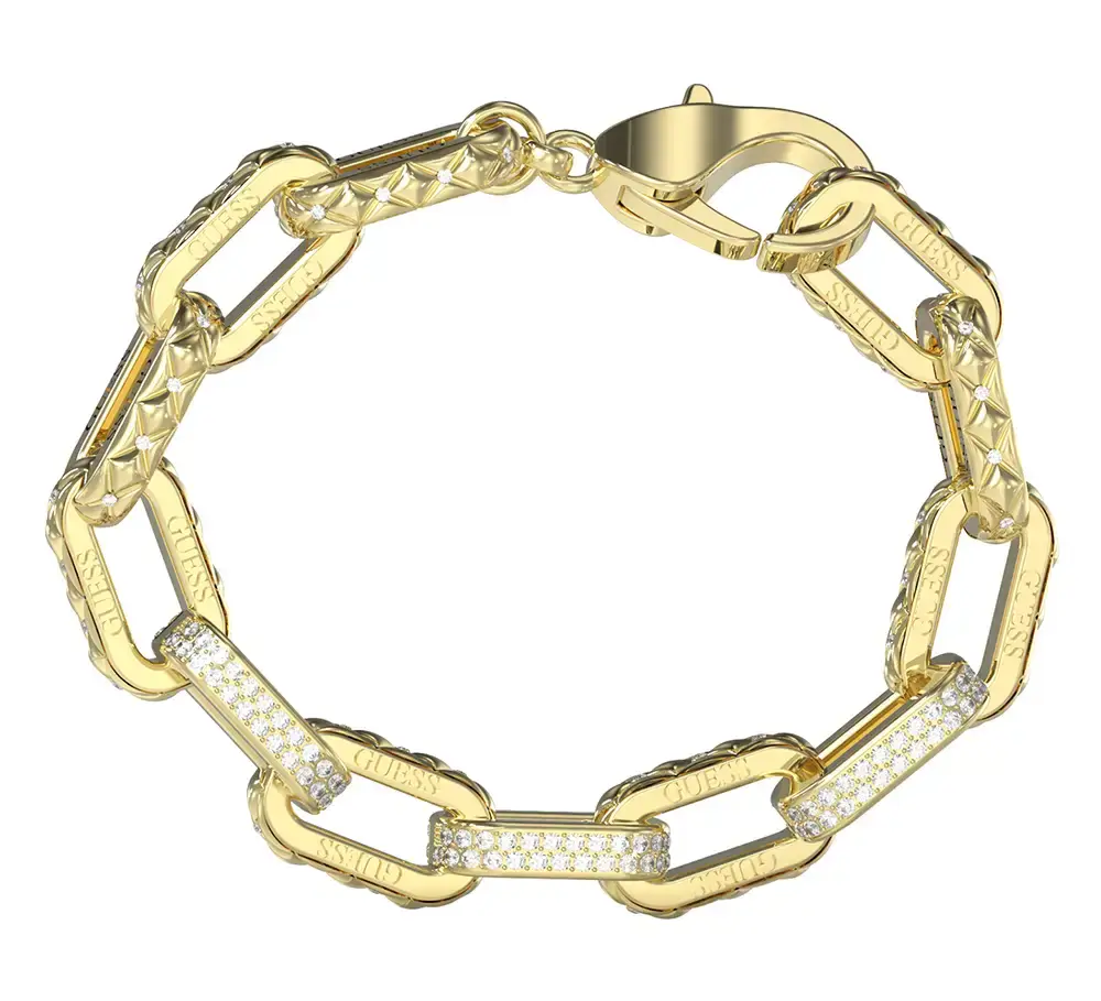 Pozłacana damska bransoletka łańcuch Guess Stylish JUBB04579JWYGS z wygodnym zapięciem na karabińczyk to wyjątkowy dodatek, który zachwyca wyrazistym designem. Wykonana z trwałej stali chirurgicznej, platerowanej żółtym złotem, cechuje się niezwykłą odpornością i elegancją. Jej charakterystyczne, duże logowane ogniwa w stylu łańcucha kotwicznego zostały efektownie ozdobione kryształkami w stylu Matelassé, co dodaje jej blasku i ekskluzywnego charakteru. Bransoletka ze stali szlachetnej złota z kolekcji Stylish Guess to ekstrawagancka i luksusowa ozdoba dla odważnych kobiet, które cenią wyraziste dodatki podkreślające ich pewną siebie i dominującą osobowość.
