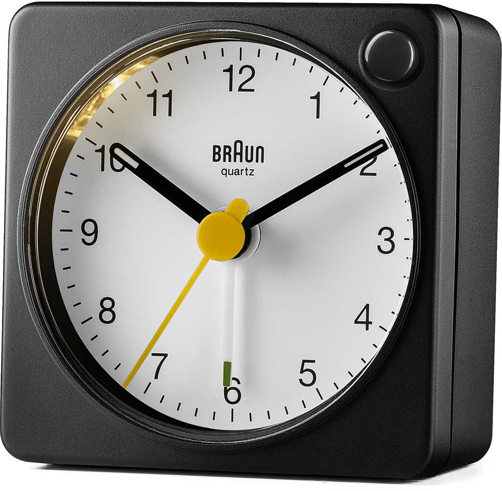 Kwadratowy, podróżny budzik Braun BC02XBW. Jego kompaktowy rozmiar i lekka konstrukcja oznaczają, że jest to idealny towarzysz podróży. Kultowa konstrukcja tego klasycznego, podróżnego, analogowego budzika Braun pochodzi od znanego modelu AB 1, zaprojektowanego pod koniec lat 80. przez Dietricha Lubsa. Ostatnio ten budzik został zaktualizowany, zawiera ulepszony mechanizm i świecące w ciemności wskazówki godzin i minut, a także funkcję drzemki i podświetlenia. Czysta, uproszczona tarcza w kolorze białym i kontrastujące wskazówki (ze świetlistymi końcówkami) zapewniają doskonałą czytelność, a mechanizm kwarcowy jest cichy i precyzyjny.