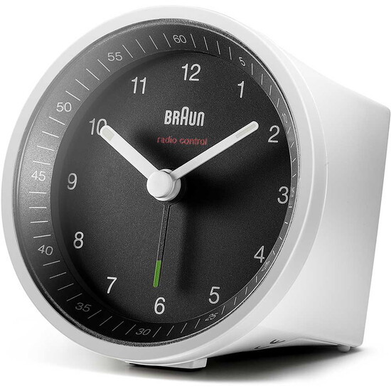 Klasyczny, okrągły budzik Braun Radio Controlled BC07WB-DCF o minimalistycznym wyglądzie z bardzo czytelną tarczą w kolorze czarnym. Wyposażony w niemiecki mechanizm kwarcowy na baterię z alarmem w formie wskazówki. Zegar sterowany jest falami radiowymi.