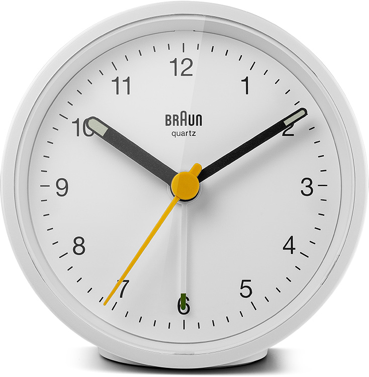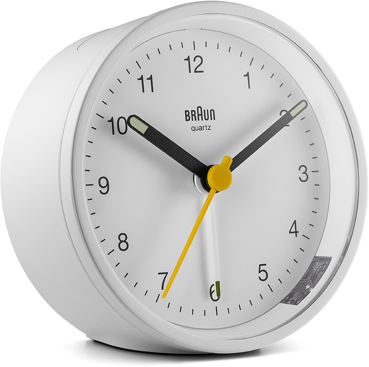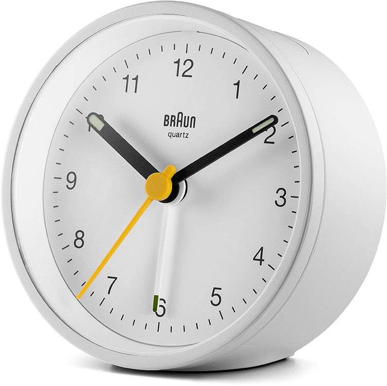 Klasyczny, okrągły budzik Braun BC12W. Obudowa i tarcza w kolorze białym, wskazówki w kolorze czarnym, żółty sekundnik i wskazówka alarmu w kolorze białym. Budzik posiada cichy, niemieckiej produkcji mechanizm kwarcowy na baterię z alarmem w formie wskazówki.