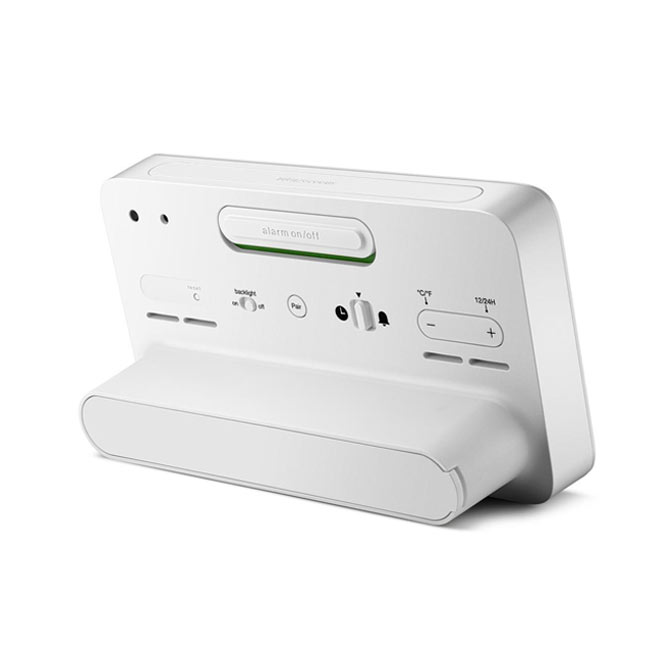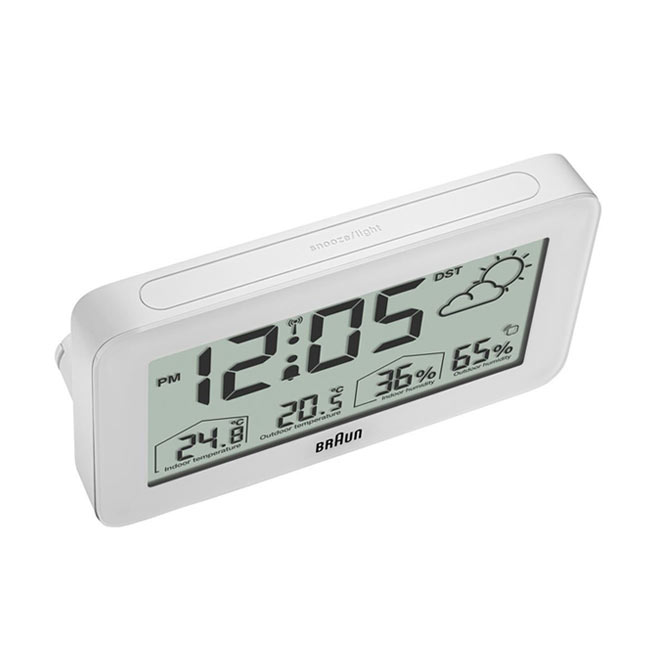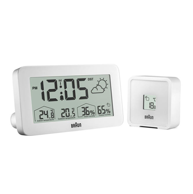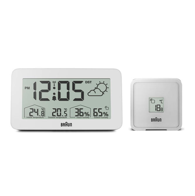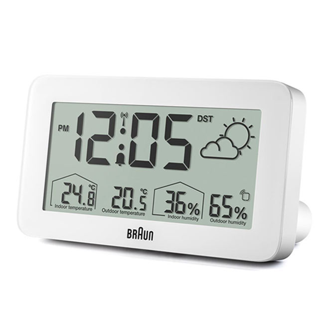 Minimalistyczny, biały budzik Braun Radio Controlled Digital Weather Station Clock to cyfrowa stacja pogodowa wyposażona w negatywowy wyświetlacz LCD z funkcją ciągłego podświetlenia wyświetlacza w warunkach słabego oświetlenia, aby zmaksymalizować widoczność w nocy. Cyfrowy budzik z wyświetlaczem pogody Braun posiada funkcję sterowania radiowego sygnału DCF dla środkowoeuropejskiej strefy czasowej, gwarantując najwyższą dokładność przez cały czas. Cyfrowy budzik sterowany radiowo może być ustawiony na tryb 12- lub 24-godzinny wyświetlania czasu. Model BC13WP-DCF zawiera konfigurowalny interfejs, który może wskazywać temperaturę wewnątrz i na zewnątrz (°C lub °F), a także wilgotność wewnątrz i na zewnątrz. Czujnik zewnętrzny również posiada wyświetlacz temperatury.