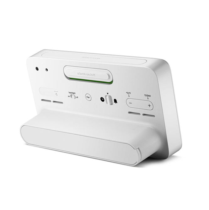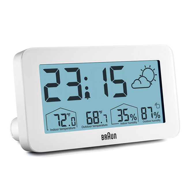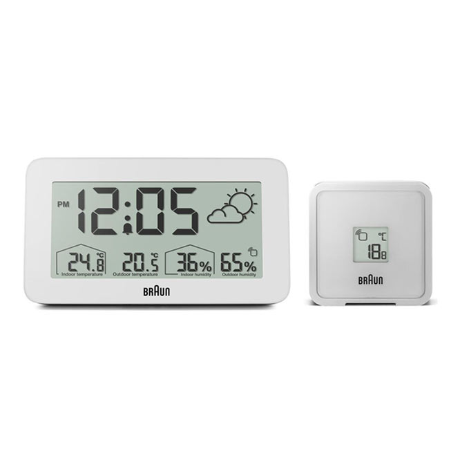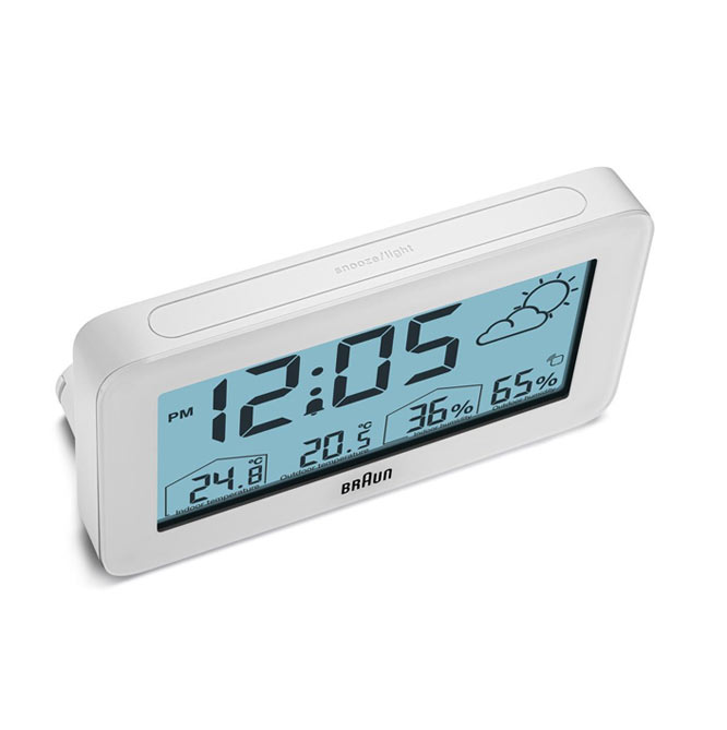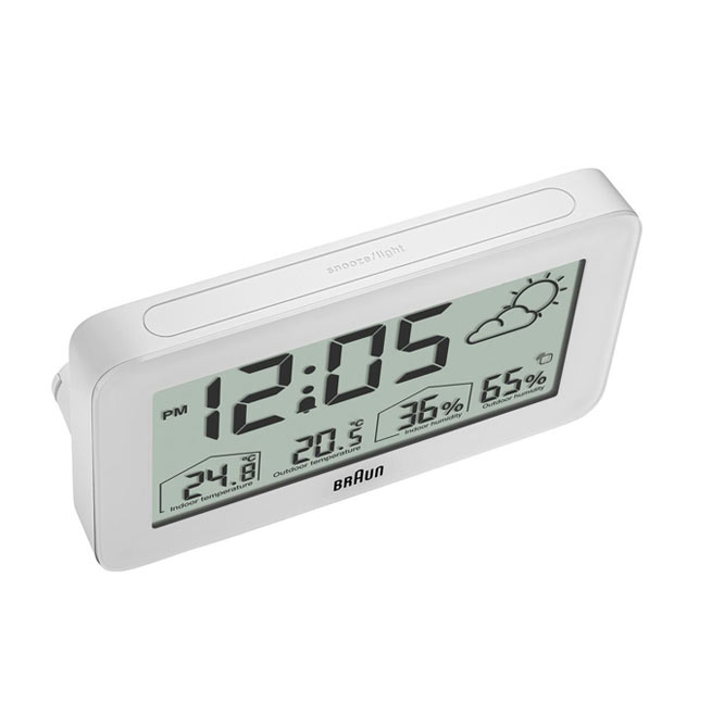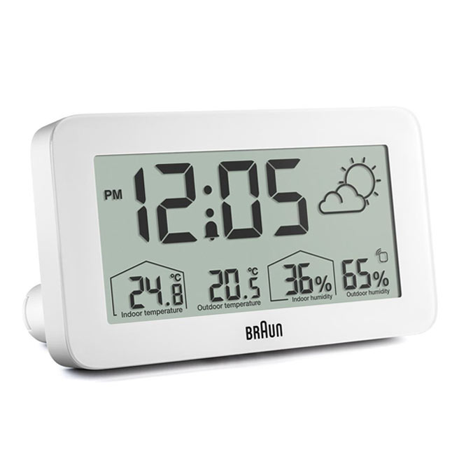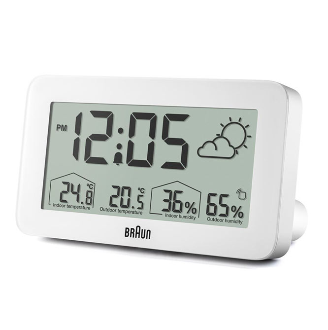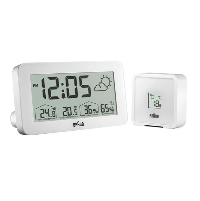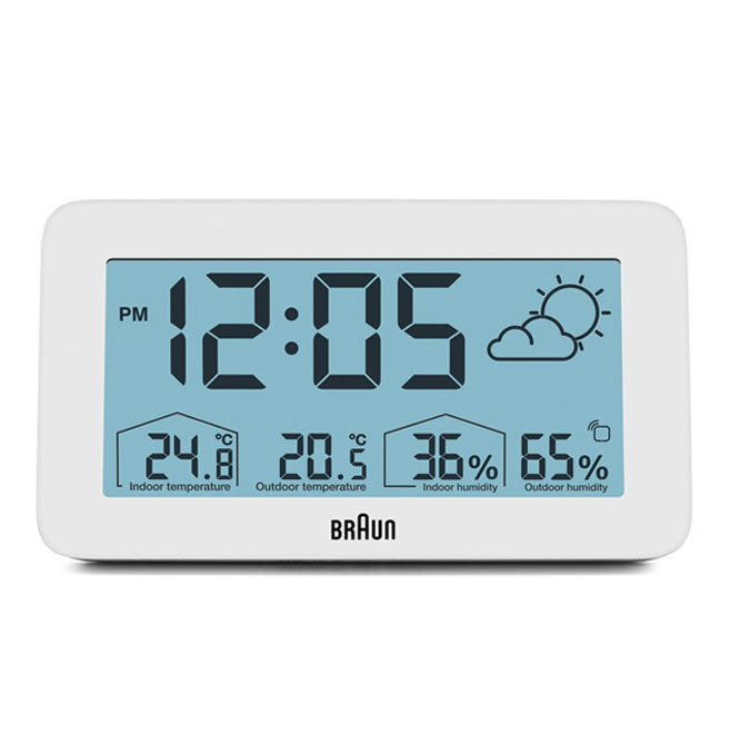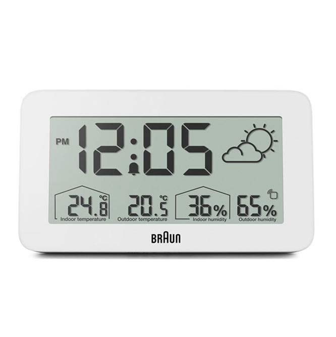 Minimalistyczny, biały budzik Braun BC13WP Digital Weather Station Clock to cyfrowa stacja pogodowa wyposażona w negatywowy wyświetlacz LCD z funkcją ciągłego podświetlenia wyświetlacza w warunkach słabego oświetlenia, aby zmaksymalizować widoczność w nocy. Cyfrowy budzik z wyświetlaczem pogody Braun może być ustawiony na tryb 12- lub 24-godzinny wyświetlania czasu. Model BC13WP zawiera konfigurowalny interfejs, który może wskazywać temperaturę wewnątrz i na zewnątrz (°C lub °F), a także wilgotność wewnątrz i na zewnątrz. Czujnik zewnętrzny również posiada wyświetlacz temperatury.
