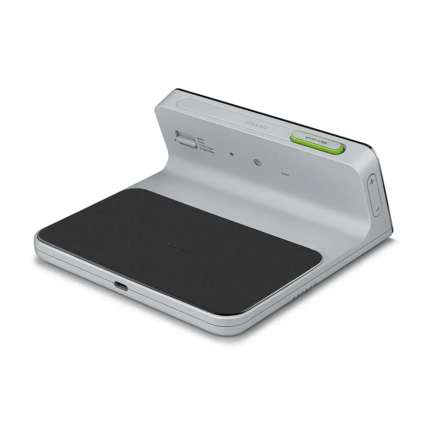 Budzik ma wbudowaną podkładkę ładującą Qi 10W, która szybko ładuje urządzenia. Dzięki silikonowej powierzchni zapobiega przegrzewaniu się i zapewnia stabilność. Wyświetlacz LCD automatycznie dostosowuje jasność, a użytkownik może wybierać między trybem 12- lub 24-godzinnym. Alarm crescendo stopniowo zwiększa głośność, a przycisk drzemki znajduje się na górze urządzenia.