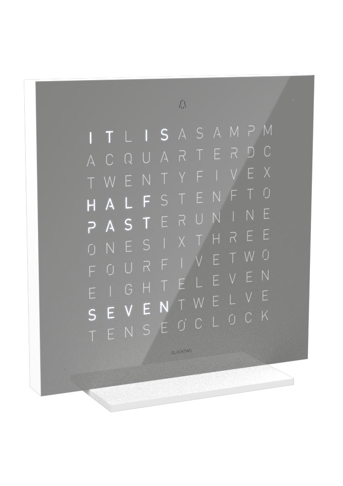 Qlocktwo Earth 13.5 Pure Early Grey Tea, to precyzyjny, dotykowy budzik do biura, salonu lub sypialni. Podobnie jak zegary z kolekcji Earth, matryca wyświetla czas w postaci pisanych słów, które lśnią czystą bielą dzięki nowoczesnej technologii LED. To zupełnie nowa, przyjazna forma wyświetlania czasu. Proces produkcyjny tego zegara stoi na najwyższym, światowym poziomie. Monolityczny korpus powstaje z jednego bloku aluminium, co stanowi kamień milowy w estetyce zegarów stołowych. Za dokładność pokazywanego czasu, odpowiada precyzyjna technologia kwarcowa.