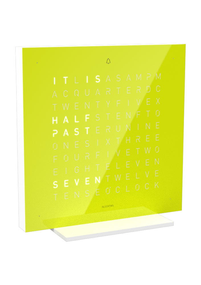 Qlocktwo Earth 13.5 Pure Lime Juice, to precyzyjny, dotykowy budzik do biura, salonu lub sypialni. Podobnie jak zegary z kolekcji Earth, matryca wyświetla czas w postaci pisanych słów, które lśnią czystą bielą dzięki nowoczesnej technologii LED. To zupełnie nowa, przyjazna forma wyświetlania czasu. Proces produkcyjny tego zegara stoi na najwyższym, światowym poziomie. Monolityczny korpus powstaje z jednego bloku aluminium, co stanowi kamień milowy w estetyce zegarów stołowych. Za dokładność pokazywanego czasu, odpowiada precyzyjna technologia kwarcowa.