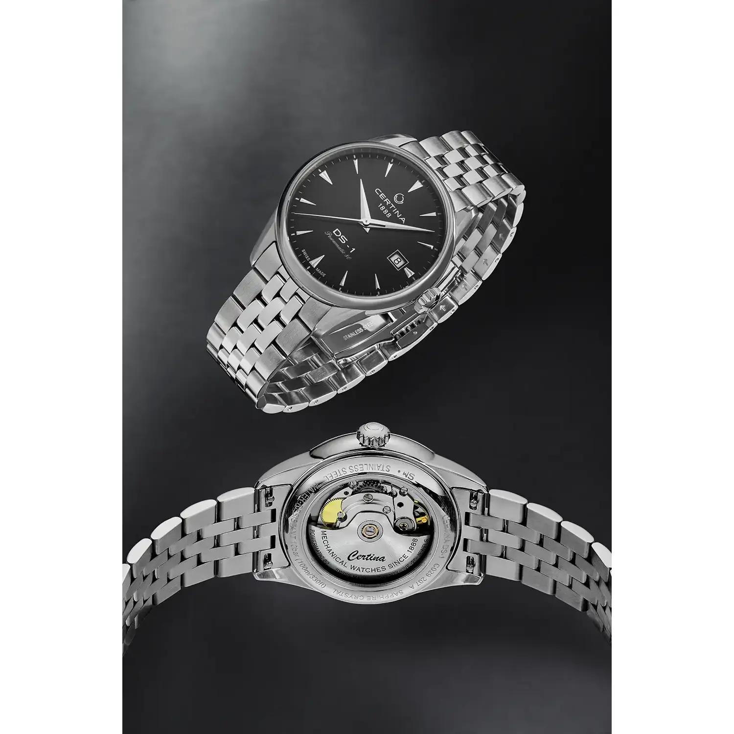 Charakterystyczne wzornictwo zegarka Certina to prawdziwa uczta dla miłośników tego estetycznego nurtu. Klasyczne indeksy na czarnej tarczy doskonale współgrają z elegancką bransoletą, tworząc harmonijną kompozycję zegarmistrzowskiej doskonałości. Tarcza z ostrymi wskazówkami nadaje zegarkowi stylowy i klasyczny wygląd, przenosząc jednocześnie noszącego do złotej ery zegarmistrzostwa. Minimalistyczna tarcza osadzona w 38-milimetrowej kopercie jest przykryta wypukłym szkłem szafirowym z antyrefleksem. Zegarek Certina na bransolecie wyposażony został w datownik, który wskazuje aktualny dzień miesiąca.