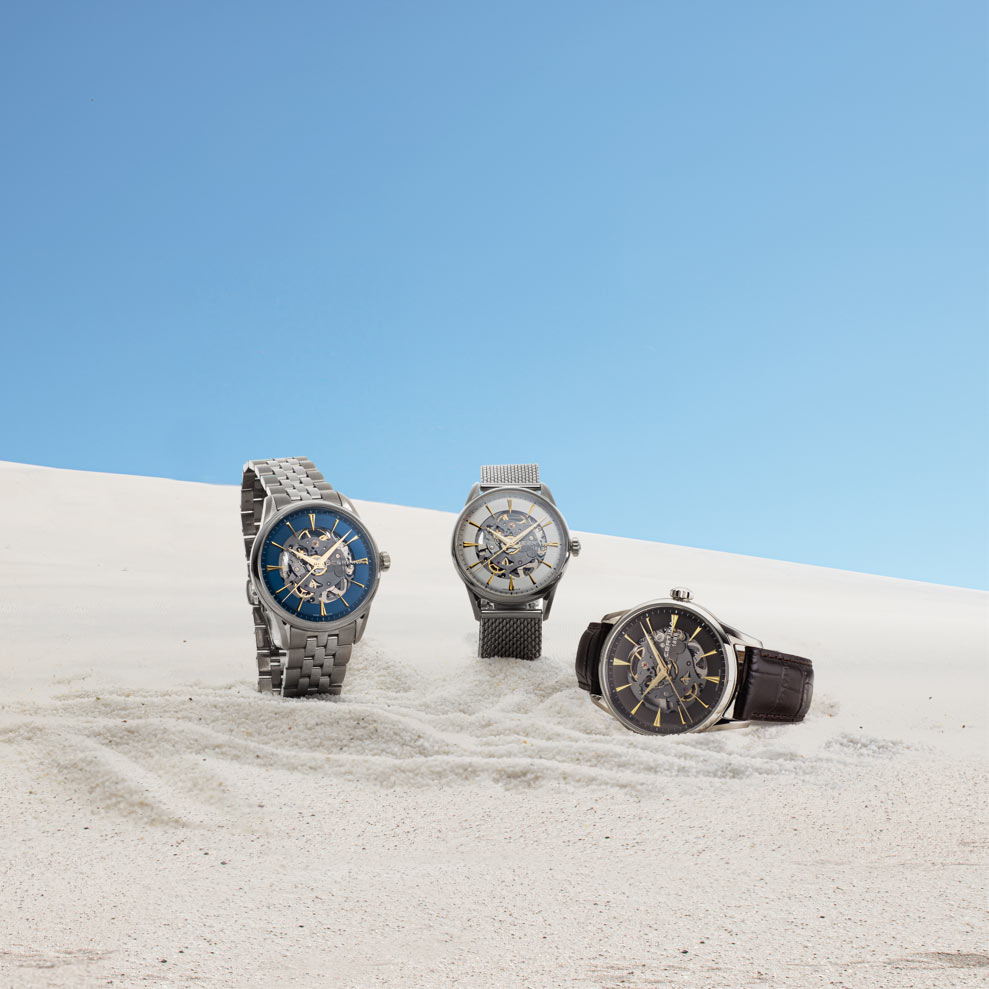 Najwyższej jakości szkło szafirowe z antyrefleksem osłania zjawiskową tarczę skeleton. W debiutanckim modelu Certina DS-1 Skeleton, właściciel zobaczyć może z bliska matową konstrukcję utrzymującą na miejscu koła zębate, kamienie i sprężynę balansu. Ponadwymiarowe pozłacane indeksy osadzono na szerokim kontrastującym pierścieniu otaczającym okrągłe okno skeletonu, oznaczając godziny akcentami o wysokim kontraście, aby zapewnić doskonałą czytelność. Dbając o lekkość i przejrzystość designu, marka Certina prezentuje DS-1 Skeleton jako klasyczny zegarek z trzema pozłacanymi wskazówkami ze stali nierdzewnej. Czasomierz z odsłoniętym mechanizmem szkieletowym Certina wyposażony został w automatyczny Powermatic 80 z wysoką rezerwą chodu do 80 godzin oraz sprężynę balansu Nivachron™. Jej antymagnetyczne właściwości i odporność zapewniają dokładność i długą żywotność tego pięknego i intrygującego werku. Szwajcarski Powermatic 80 to interesujący przykład doskonałego szwajcarskiego zegarmistrzostwa.