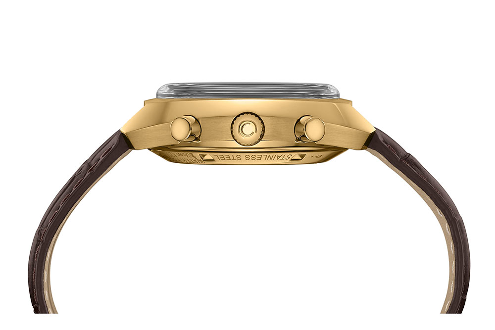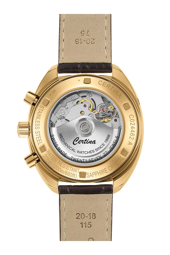 Pozłacana koperta w kształcie tonneau wykonana jest ze stali szlachetnej klasy 316L w męskim rozmiarze 43.30 mm i uszczelniona do 200 metrów. Odporność na wodę do 20 atmosfer pozwala na nurkowanie z zegarkiem na nadgarstku bez obawy o uszkodzenie mechanizmu. Zegarek zestawiony został z lekkim paskiem skórzanym w kolorze brązowym z bezpiecznym i wygodnym zapięciem motylkowym pozłacanym powłoką PVD. Na prawej stronie obudowy umieszczono zakręcaną koronkę i przyciski do obsługi chronografu. Zakręcana koronka jest kolejnym elementem zabezpieczającym mechanizm przed wodą, kurzem i innymi zagrożeniami. Tradycyjnie czasomierz z serii DS posiada opatentowany system Double Security stanowiący rozbudowany układ zabezpieczeń konstrukcji. Nazwa zegarka mówi sama za siebie: DS-2 jest przygotowany na każdą sytuację.