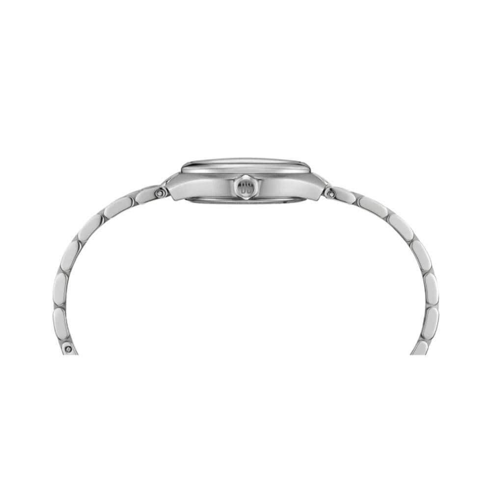 Koperta o średnicy 27.80 mm utrzymana jest w srebrnym odcieniu. Bransoleta w tej samej tonacji, posiada solidne ogniwa ze stali, które nadają całości spójny, biżuteryjny efekt. Zegarek jest odporny na codzienne użytkowanie, a jego smukła forma gwarantuje komfort noszenia nawet przez wiele godzin. Klasa szczelności do 100 metrów sprawia, że czasomierz ten nie boi się wody — można z nim swobodnie pływać.