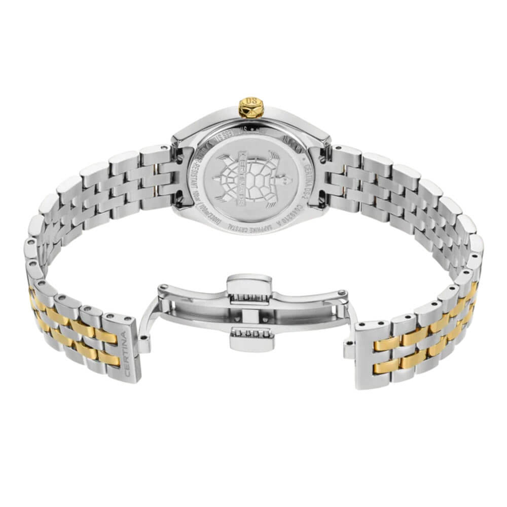 Tarcza z masy perłowej prezentuje indeksy wysadzane diamentami oraz pozłacane wskazówki, które harmonijnie komponują się z kolorystyką koperty i bransolety. W jej wnętrzu pracuje szwajcarski mechanizm F04.412, znany z wysokiej precyzji i niezawodności. Zegarek damski z diamentami Certina C049.210.22.116.00 to dwukolorowy model, który łączy ponadczasowe piękno z zaawansowaną technologią, stając się subtelnym, ale wyrazistym dopełnieniem kobiecego stylu.