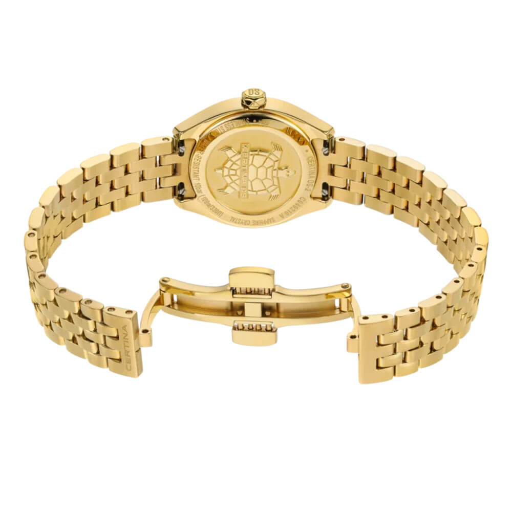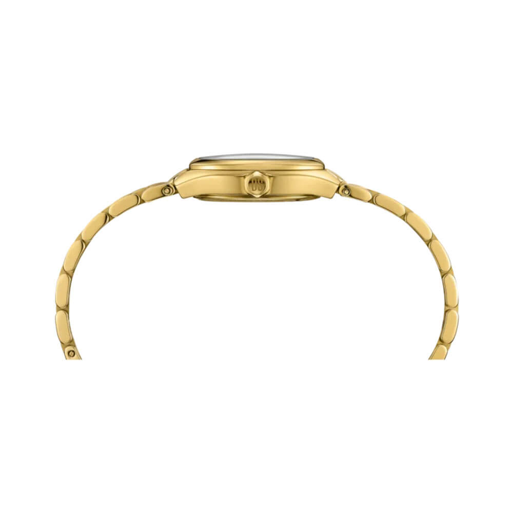 Koperta o średnicy 27.80 mm utrzymana jest w złotym odcieniu, gdzie stal szlachetna została zestawiona ze złotą powłoką PVD, podkreślającymi jej wyrafinowany charakter. Bransoleta, również w złotej tonacji, posiada stalowe ogniwa, które nadają całości spójny, biżuteryjny efekt. Zegarek jest odporny na codzienne użytkowanie, a jego smukła forma gwarantuje komfort noszenia nawet przez wiele godzin. Klasa szczelności do 100 metrów sprawia, że czasomierz ten nie boi się wody — można z nim swobodnie pływać.