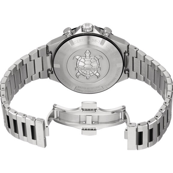 Męski chronograf na bransolecie DS-7 Chronograph uosabia szwajcarską jakość o prawdziwie sportowym charakterze, którą marka dostarcza niezmiennie od 1888 roku. Certina do produkcji swoich zegarków uważnie dobiera wysokiej jakości, wytrzymałe i niezawodne materiały. Takie, które spełniają standardy komfortu użytkowania, estetyki i sportowej linii, jakich się wymaga od profesjonalnych modeli do użytkowania na co dzień. W związku z tym zarówno 41-milimetrową okrągłą kopertę, jak i trzyrzędową bransoletę z zapięciem motylkowym na 2 przyciski i systemem szybkiej zmiany paska zbudowano ze stali szlachetnej klasy 316L. Ten wysokiej jakości stop odznacza się właściwościami hipoalergicznymi, zapewniając delikatny stosunek do wrażliwej skóry. Ponadto stal nierdzewna to idealny wybór dla aktywnych użytkowników, bo jest wysoce odporna na zarysowania i korozję. To z kolei nie tylko oznacza imponującą trwałość zegarka, ale i zachowanie estetycznego wyglądu przez długi czas. Środkowe ogniwa bransolety oraz wybrane elementy koperty pokryto odporną na ścieranie powłoką PVD w kolorze czerni. Funkcjonalną tarczę z podświetlanymi indeksami i wskazówkami osłania odporne na zarysowania szkło szafirowe wzbogacone o jednostronny antyrefleks.