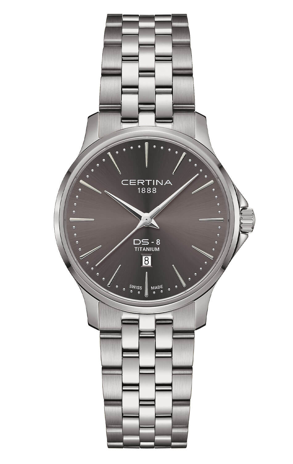 Certina DS-8 Lady to elegancki zegarek damski o mniejszym rozmiarze, który łączy w sobie klasyczny design z nowoczesną technologią. Jest wyposażony w precyzyjny mechanizm kwarcowy Precidrive™, szafirowe szkło z antyrefleksyjną powłoką, wykonany z wyjątkowo trwałego tytanu klasy 2. Dodatkowo, posiada wodoodporność do 10 barów, system podwójnego zabezpieczenia DS Concept, a także wielorzędową bransoletę z systemem szybkiej wymiany.