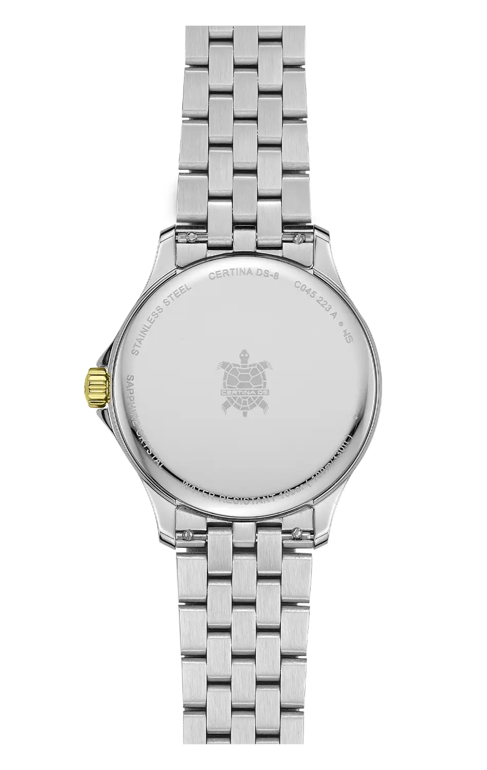 Koperta o kompaktowej średnicy 32 mm została wykonana ze stali szlachetnej i połączona z solidną, pięciorzędową bransoletą o naprzemiennie szczotkowanych i polerowanych ogniwach. Bezel i środkowe ogniwa bransolety pokryte są powłoką PVD w kolorze złotym, co dodaje całości charakteru, biżuteryjnego stylu, ale również wzmacnia materiał. Szkło szafirowe z powłoką antyrefleksyjną dba o czytelność w każdych warunkach, a stalowy dekiel z charakterystycznym żółwiem Certiny przypomina o trwałości systemu DS. Opatentowany system DS uzupełniony jest o wodoszczelność do 100 metrów dekla, co sprawia, że elegancja idzie tu w parze z praktycznością.