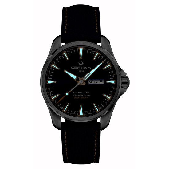 Certina DS Action Day-Date C0324301804101 to stalowa koperta o średnicy 41 mm uszczelniona do 200 metrów. Na froncie znajduje się wysoce odporne na zarysowania szkło szafirowe z antyrefleksem, które chroni tarczę zegarka. Na tarczy znajdują się trzy wskazówki, indeksy oraz okienko wyświetlające dzień tygodnia i miesiąca. Zegarek działa dzięki mechanizmowi Powermatic 80 z rezerwą chodu do 80 godzin i sprężyną antymagnetyczną Nivachron. Bijące serce czasomierza jest precyzyjne, a rezerwa pozwala na przerwę w jego użytkowaniu bez obawy o zatrzymanie pracy. Do uszu zegarka przymocowany został lekki i wygodny pasek materiałowy w kolorze niebieskim.