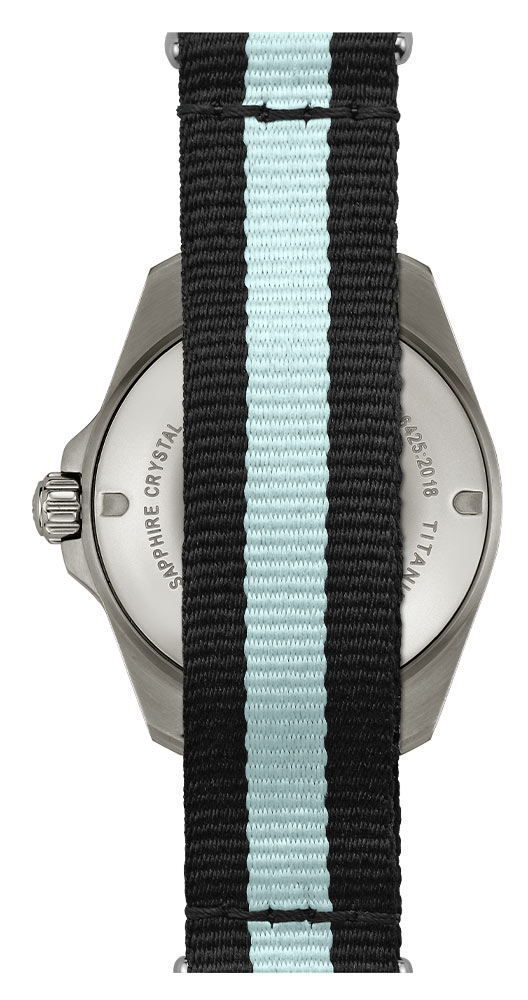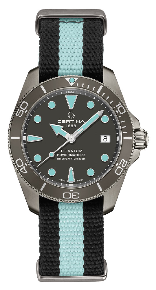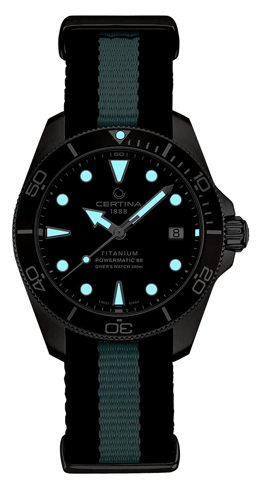 We wprowadzonej wersji, zalety całej rodziny zegarków osiągnęły najwyższy poziom. Zegarek Certina DS Action Diver C0328074808100 został umieszczony w tytanowej kopercie o rozmiarze 38 mm i spełnia - podobnie jak inne modele - wymogi restrykcyjnej normy ISO 6425, odnoszącej się do zegarków do nurkowania. Pierścień lunety wykonano z lekkiego, wytrzymałego i hipoalergicznego aluminium, które dobrze przyjmuje aplikowane pigmenty, dzięki czemu kolekcja DS Action Diver ma do zaoferowania zegarki z pierścieniami w aż 4 wariantach kolorystycznych. Oznaczenia godzin typu diver i wskazówki w rodzaju Broad Arrow wypełniono świecącą w ciemności masą Super-LumiNova, natomiast tarczę zabezpieczono najwyższej jakości, nierysującym się szkłem szafirowym z powłoką antyrefleksyjną po wewnętrznej stronie. Do uszu przymocowany został lekki i wygodny w noszeniu pasek materiałowy typu NATO.