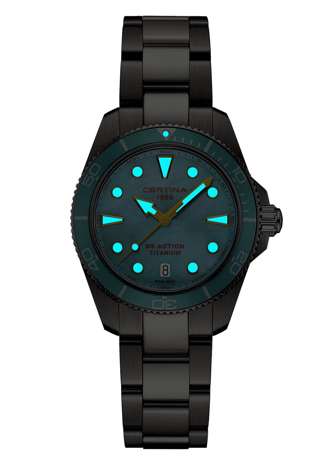 Zegarek Certina C0482104413100 został wykonany z najwyższej jakości tytanu, cenionej za odporność na korozję, uszkodzenia i niską wagę. Koperta o średnicy 34.50 mm subtelnie dopasowuje się do kobiecego nadgarstka, zapewniając komfort i doskonały wygląd. Wytrzymała bransoleta z tytanu z praktycznym zapięciem motylkowym gwarantuje wygodę noszenia i bezpieczeństwo. Model oferuje klasę szczelności do 300 metrów, co pozwala na swobodne odkrywanie podwodnych głębin. Dodatkowym atutem są zakręcana koronka i dekiel, które wzmacniają konstrukcję zegarka, czyniąc go niezawodnym nawet w ekstremalnych sytuacjach. Obrotowy bezel ze skalą minutową nałożony na obudowie zegarka, pomoże śledzić upływający czas w chwili zanurzenia, lub w razie innych potrzeb.