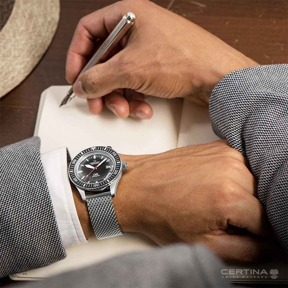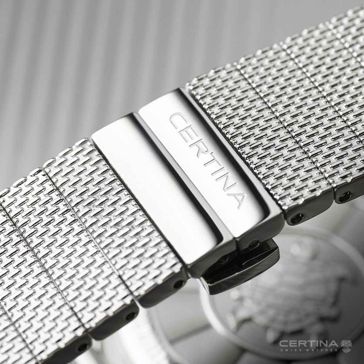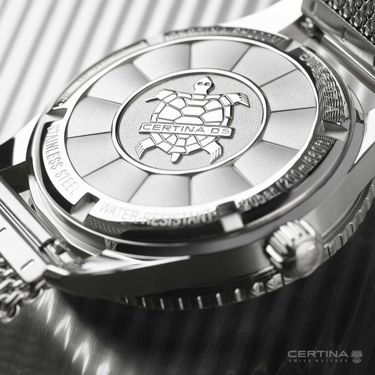 W 2019 roku Certina wprowadza nową edycję tego pięknego, klasycznego zegarka. Wykonana z połączenia materiałów stali szlachetnej i aluminium, koperta o średnicy 42,8 mm wyposażona jest w obracający się w jednym kierunku czarny pierścień lunety. Czarna matowa tarcza idealnie kontrastuje ze wskazówkami i indeksami pokrytymi substancją Super-LumiNova nawet w ciemności. Na odwrocie zegarka znajduje się wypukły symbol żółwia marki Certina, symbol trwałości. Całość dopełnia bransoleta typu mesh (stalowy splot) oraz tekstylny pasek NATO, który idealnie sprawdzi się podczas letnich dni (dodawany w zestawie).