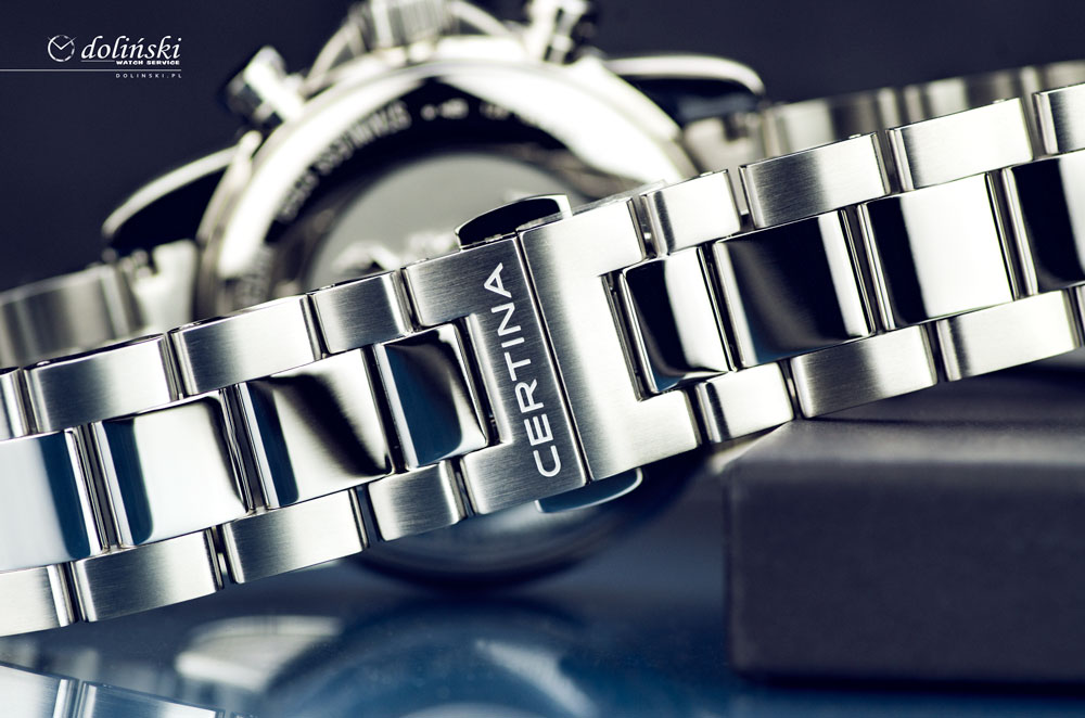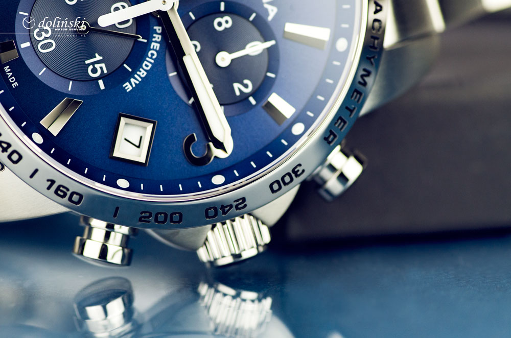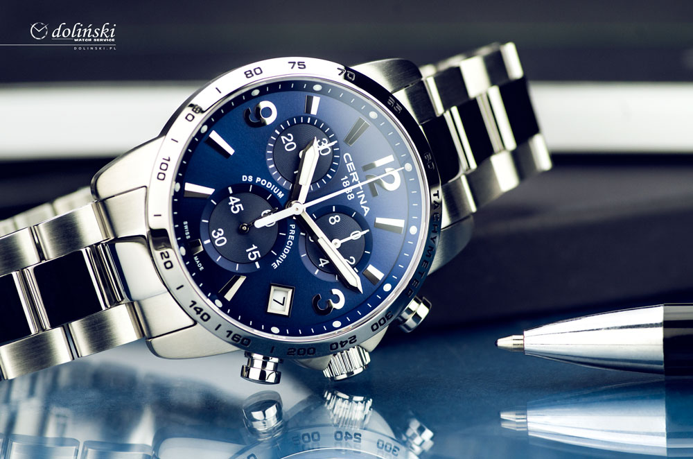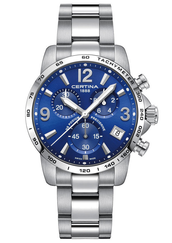 Sportowy i elegancki zegarek szwajcarski Certina. Wykonany ze stali szlachetnej posiada najwyższej jakości mechanizm kwarcowy Precidrive z chronografem, stoperem odmierzającym dziesiętne sekundy, sekundy oraz minuty. Chronografy kwarcowe Precidrive marki Certina wyróżniają się niezwykłą dokładnością nie tylko dlatego, że wykorzystują technologię kwarcową, ale również dzięki kompensacji wskazań opierających się na podstawie zmiany temperatury (tzw. termo kompensacja), a także odporności na wilgoć. Pozwala to uzyskać niezwykle precyzyjny pomiar czasu +/- 10 sekund na rok. W zegarkach Certina DS Podium Chrono Precidrive zastosowano nowatorski technologicznie system zabezpieczeń DS skrót od Double Security - systemu podwójnego uszczelnienia, kolorowe wskazówki oraz elementy cyferblatu nadają czasomierzom niepowtarzalny sportowy styl. Każdy z modeli jest wyjątkowy technologicznie co sprawia, że koncept zegarka sportowo eleganckiego przyciąga wzrok i powoduje szybsze bicie serca.