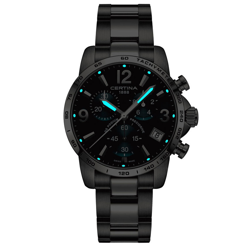 Sportowy i elegancki zegarek szwajcarski Certina. Wykonany ze stali szlachetnej posiada najwyższej jakości mechanizm kwarcowy Precidrive z chronografem, stoperem odmierzającym dziesiętne sekundy, sekundy oraz minuty. Chronografy kwarcowe Precidrive marki Certina wyróżniają się niezwykłą dokładnością nie tylko dlatego, że wykorzystują technologię kwarcową, ale również dzięki kompensacji wskazań opierających się na podstawie zmiany temperatury (tzw. termo kompensacja), a także odporności na wilgoć. Pozwala to uzyskać niezwykle precyzyjny pomiar czasu +/- 10 sekund na rok. W zegarkach Certina DS Podium Chrono Precidrive zastosowano nowatorski technologicznie system zabezpieczeń DS skrót od Double Security - systemu podwójnego uszczelnienia, kolorowe wskazówki oraz elementy cyferblatu nadają czasomierzom niepowtarzalny sportowy styl. Każdy z modeli jest wyjątkowy technologicznie co sprawia, że koncept zegarka sportowo eleganckiego przyciąga wzrok i powoduje szybsze bicie serca.