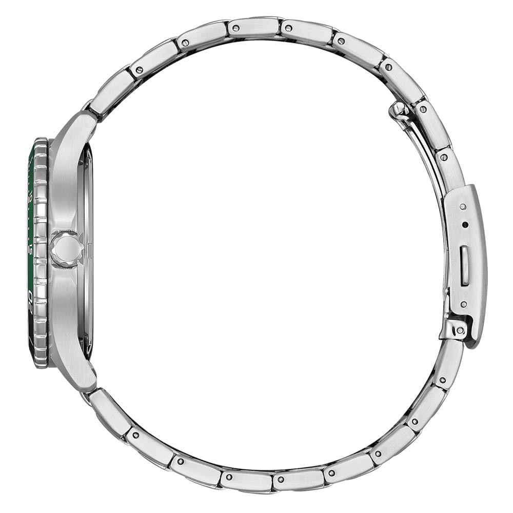 Solidna stalowa bransoleta otwierana za pomocą przycisków, nie tylko nadaje nowoczesnego charakteru, ale również gwarantuje trwałość w trudnych warunkach. Zielona tarcza jest niezwykle czytelna, idealna zarówno na basenie, jak i podczas wieczornych wyjść. Indeksy i wskazówki zegarka są pokryte substancją luminescencyjną, co zapewnia doskonałą czytelność w warunkach niskiego oświetlenia. To szczególnie przydatne podczas nurkowania czy w ciemności. Wskazówki mają charakterystyczny kształt grotu, co dodaje czasomierzowi ostrego, sportowego i dynamicznego wyglądu.