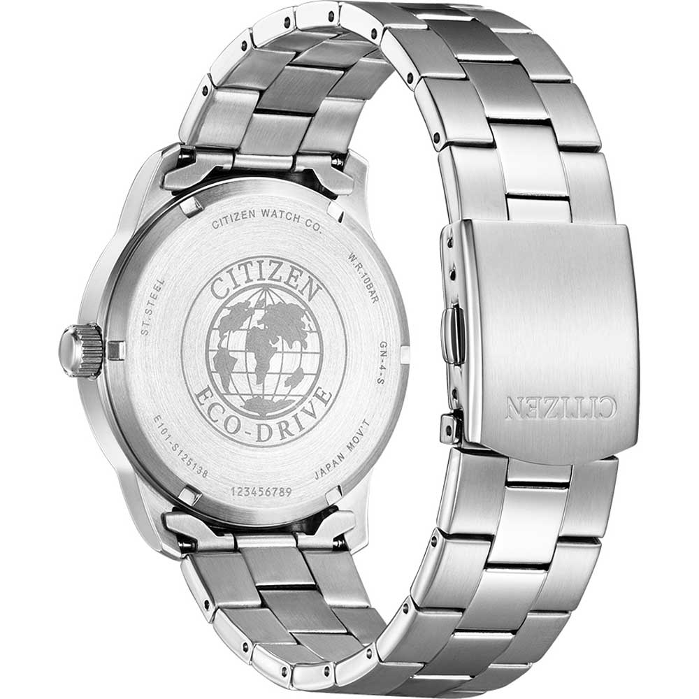 Citizen BM8550-81AC elegancki zegarek przewidziany dla mężczyzn. Klasyczna koperta ze stali szlachetnej o średnicy 42 mm, zamknięta mineralnym szkłem. Biała tarcza ozdobiona czytelnymi indeksami arabskimi. Na godzinie trzeciej japoński producent umieścił rozbudowany datownik. Pokazuje on cyfrę dnia miesiąca i nazwę dnia tygodnia. Zaostrzone wskazówki dodają elegancji. Od spodu czasomierza znajduje się zakręcany dekiel, który uszczelnia całą konstrukcję do 10 barów/ 100 m, co pozwala na pływanie z zegarkiem. Citizen zastosował kultowy mechanizm Eco-Drive, który jest zasilany światłem, eliminując tym samym konieczność wymiany baterii. Jest to ekologiczne i ekonomiczne rozwiązanie, które jest cały czas rozwijane przez Citizena.