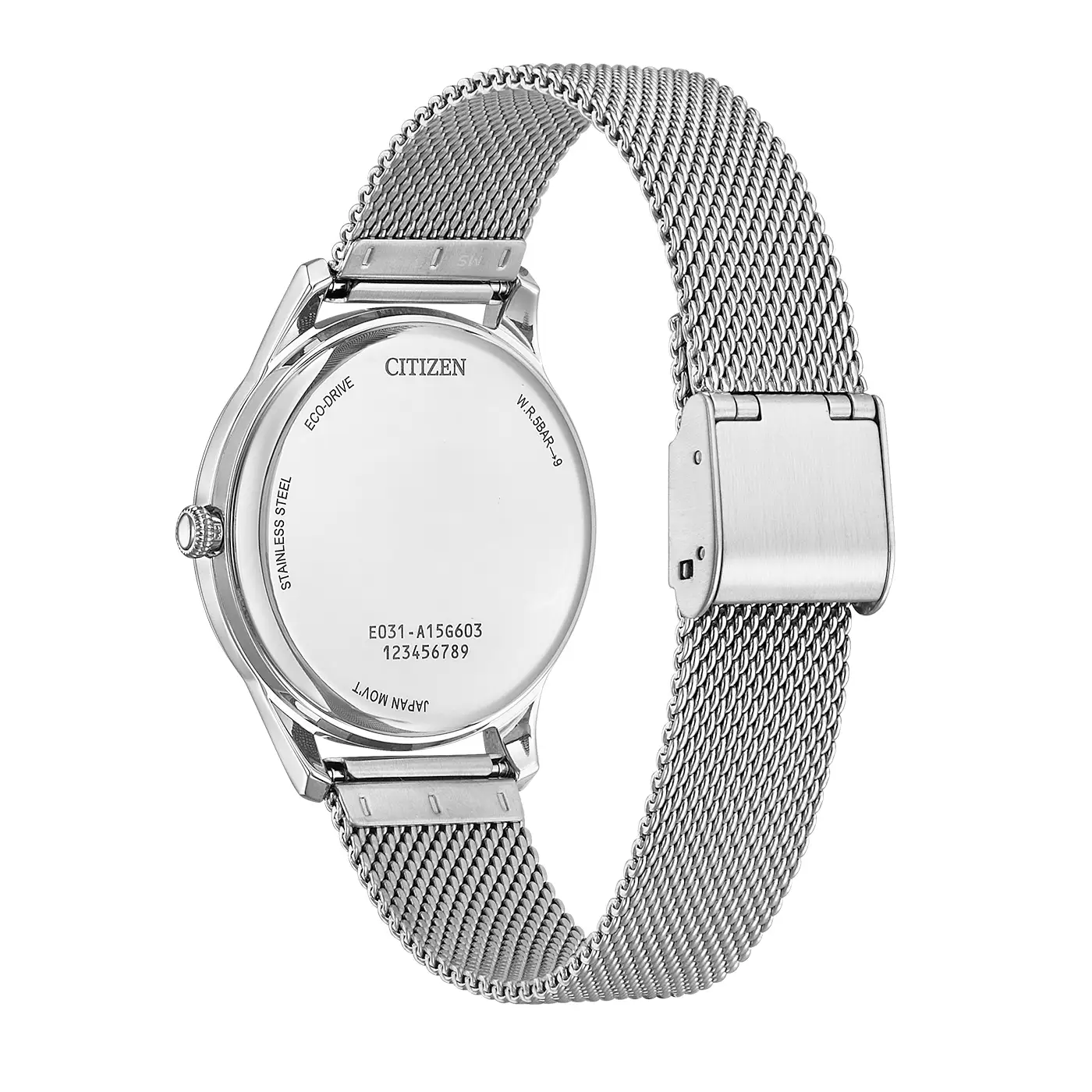 Koperta o średnicy 34 mm wykonana ze stali szlachetnej zachwyca swoją smukłością, mierząc zaledwie nieco ponad 7 mm wysokości. Dzięki tak niskiej wadze, wynoszącej jedynie 52 gramy, zegarek jest niezwykle komfortowy i niemal niewyczuwalny podczas codziennego noszenia. Całość osadzono na bransolecie typu mesh, której gęsty, mediolański splot zapewnia doskonałą wentylację skóry i idealne dopasowanie do kształtu nadgarstka, co czyni go doskonałym wyborem zarówno do biurowej koszuli, jak i zwiewnej letniej sukienki.