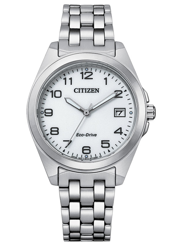 Klasyczny zegarek damski Citizen Classic Elegance EO1210-83A wykonany ze stali szlachetnej. Koperta o średnicy 33,50 mm posiada kanciaste brzegi oraz elementy polerowane i matowane. Kontynuację wzoru można zauważyć na bransolecie z odkuwanych elementów, co sprawia, że jest niesamowicie wytrzymała. Na szczególną uwagę zasługuje elegancka tarcza w kolorze białym z przyciągającym wzrok zdobieniem w formie pionowych pasów. Duże indeksy arabskie i wskazówki są czytelne, a chroni je odporne na zarysowania szkło szafirowe. Wewnątrz pracuje niezawodny i ekologiczny (brak baterii) mechanizm zasilany światłem, który magazynuję energię potrzebną do pracy w akumulatorze.